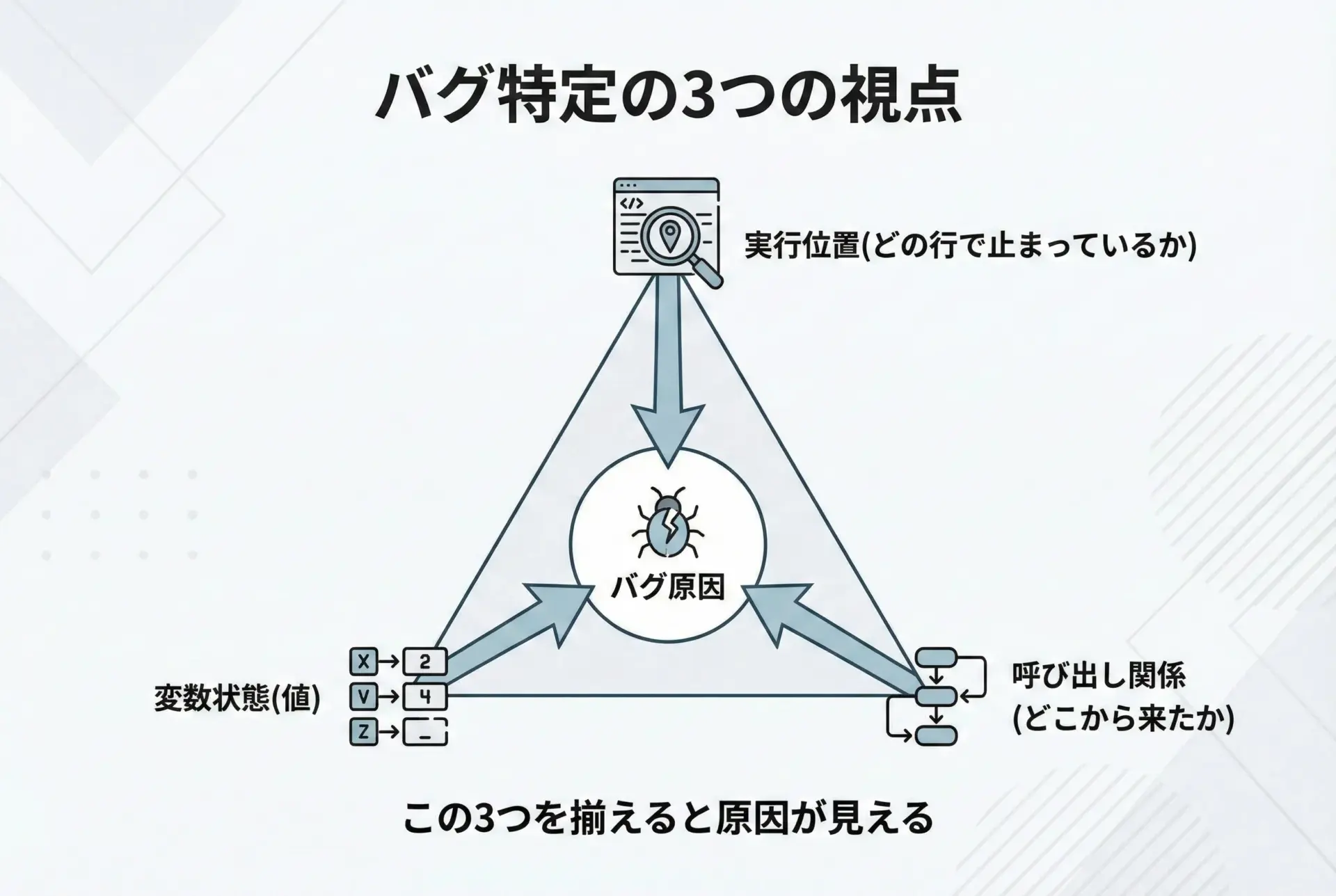 バグの原因が複数の関数をまたいでいる場合、「どの関数からどの関数が呼ばれて、最終的にどこで落ちたのか」という呼び出し履歴を追う必要があります。