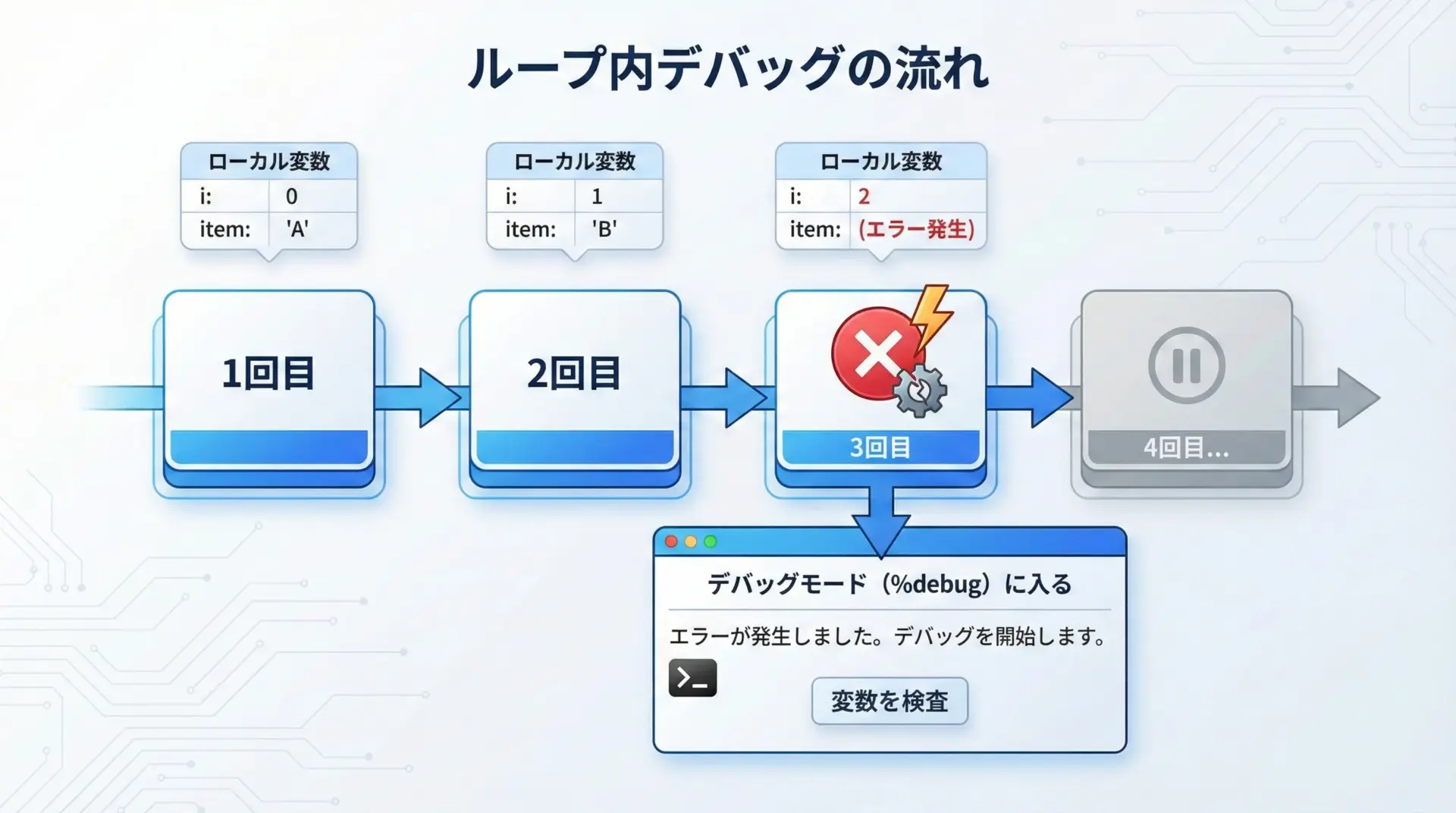 このように、「どのインデックス(i)で、どんな値(item)が来ていたのか」をその場で確認できるため、エラー条件の特定が非常に楽になります。
