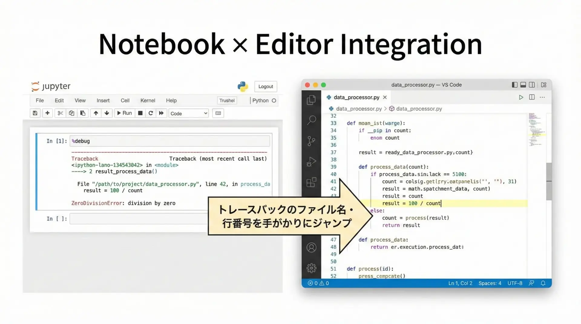このようにNotebookを「実験場」、テキストエディタを「コードの本体編集環境」と割り切り、%debugで見つけた情報を即座にエディタに反映することで、快適な開発サイクルを回すことができます。