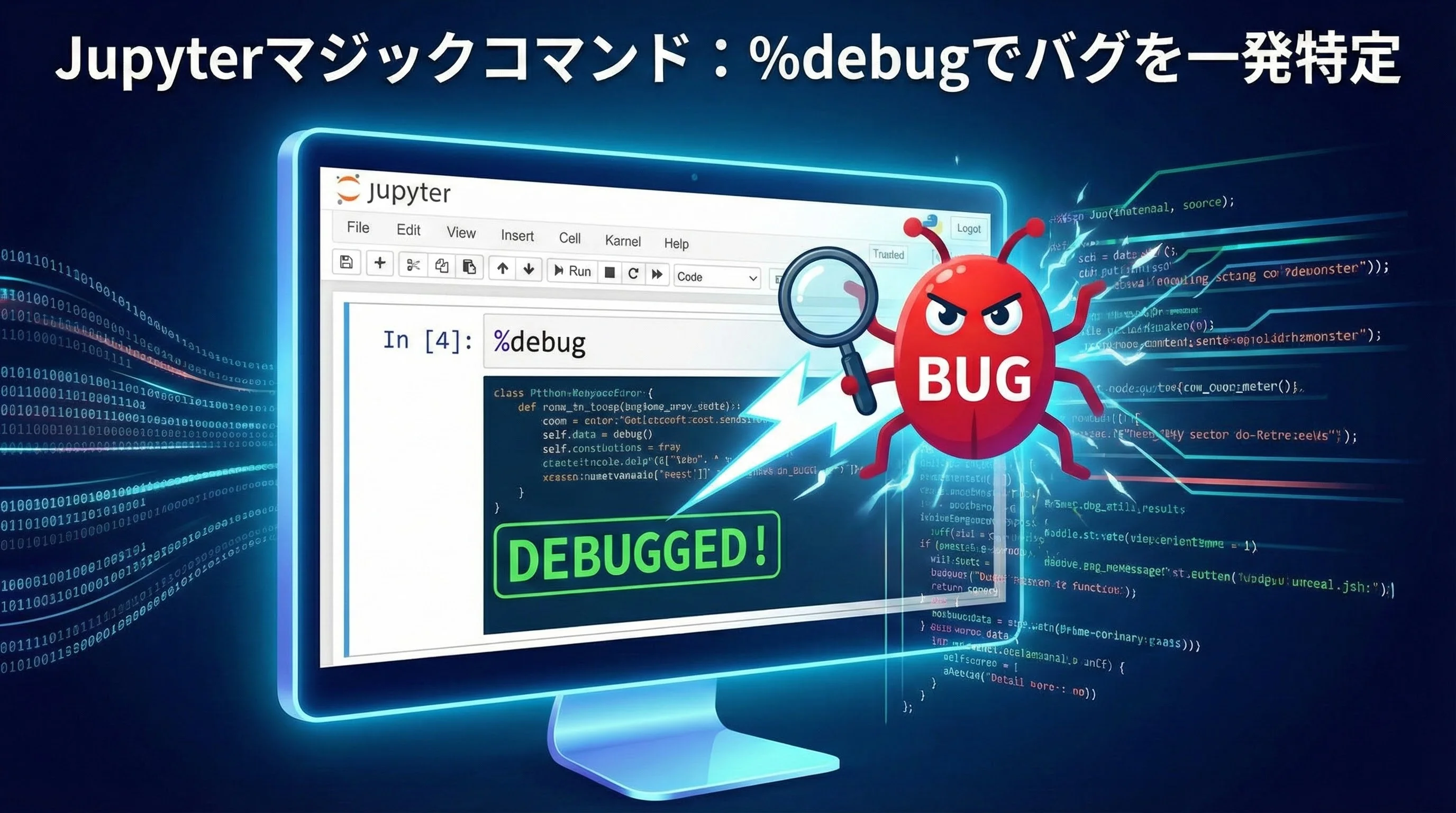 Jupyterの%debugマジックコマンドは、エラーが出た直後の世界に飛び込んで、コードの流れや変数の状態を対話的に調べられる強力なデバッグ手段です。