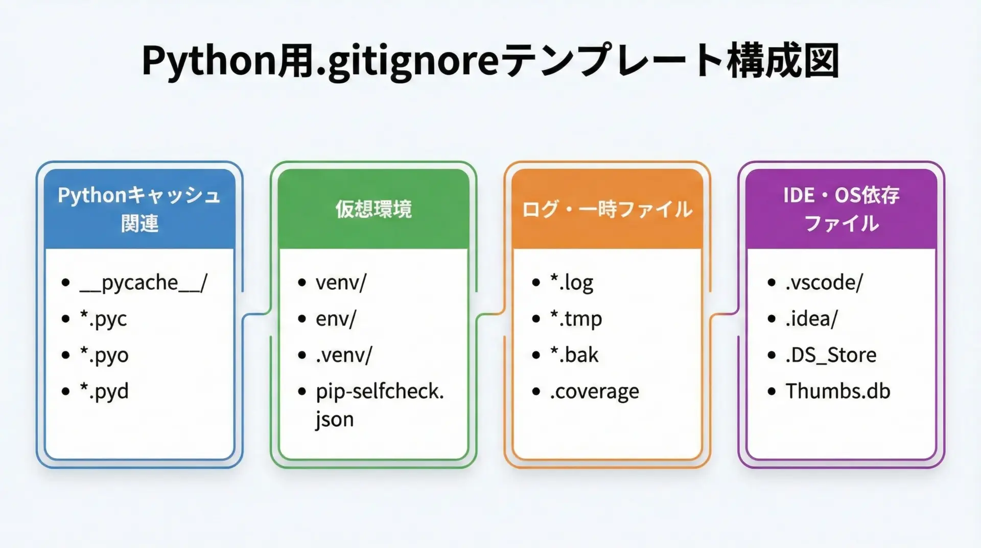 特に、機密情報を含む.envや巨大なvenvディレクトリを誤ってコミットしないためにも、プロジェクト開始時にテンプレートを基に.gitignoreを用意し、チーム全体でルールを共有することが重要です。
