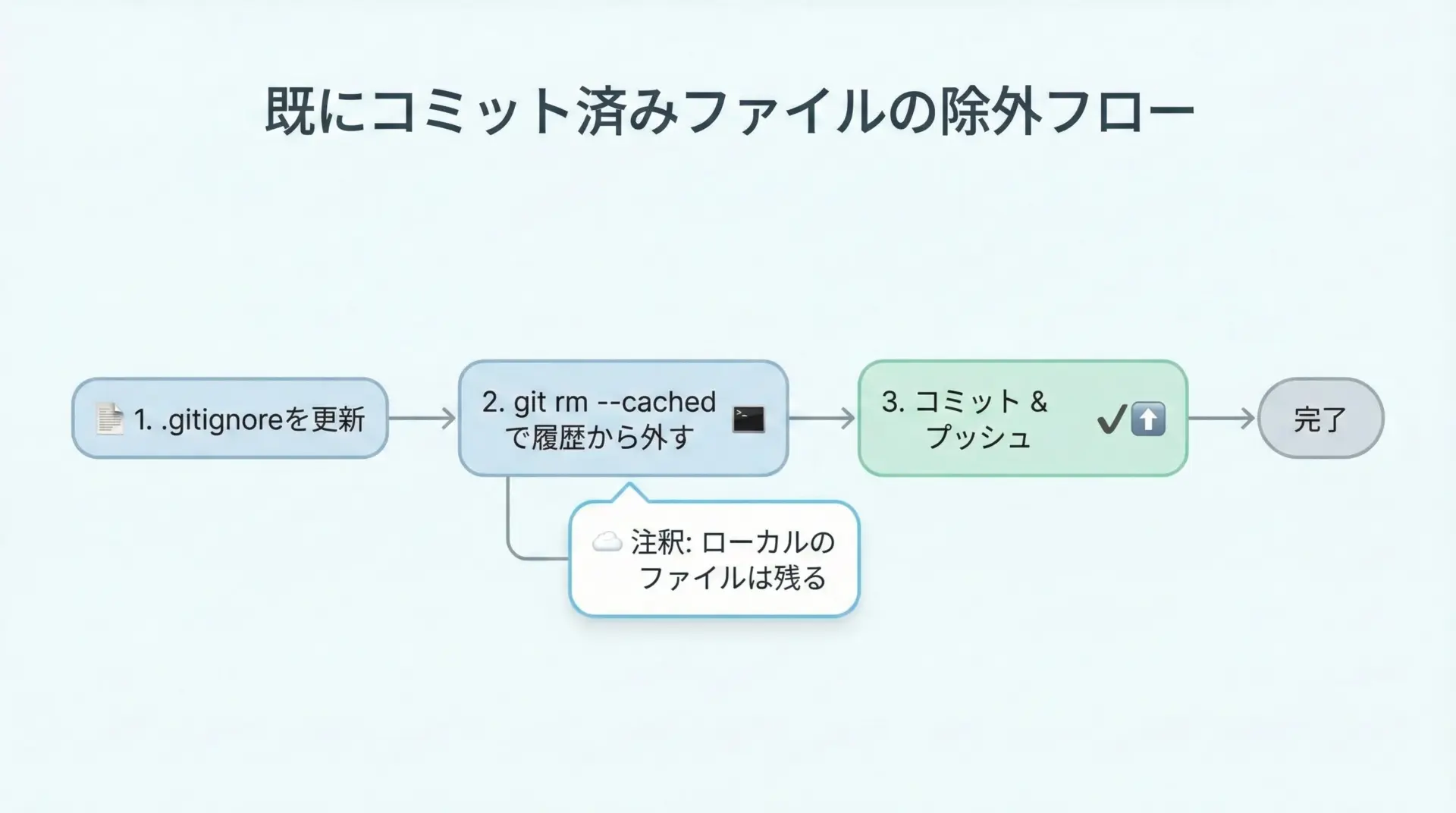 git rm --cachedを使うことで、リポジトリからはファイルが削除されますが、ローカルディスク上の実ファイルは残ることが重要です。