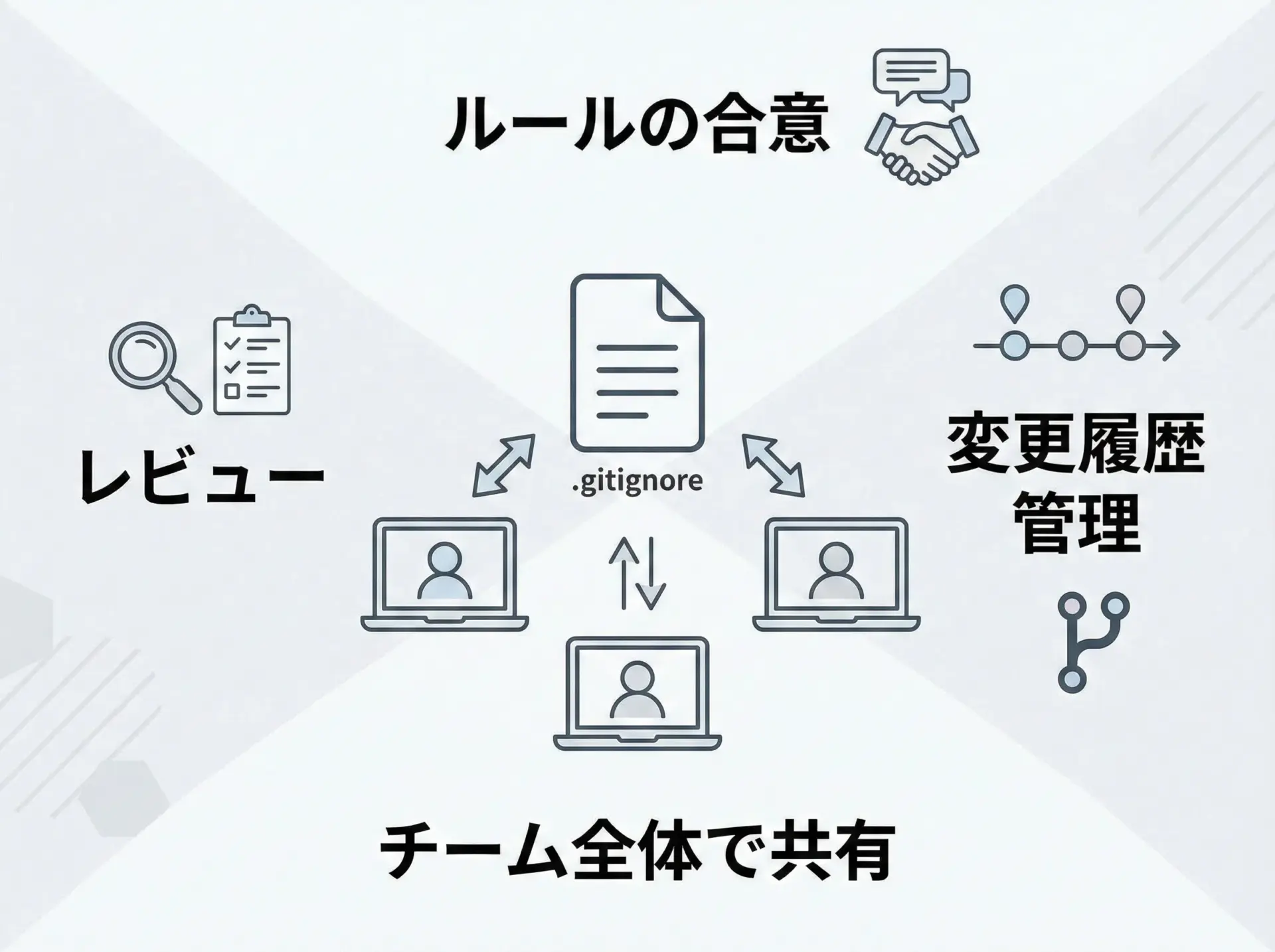 また、.gitignoreの変更も通常のコードと同じようにプルリクエストやレビューの対象にすることで、「うっかり必要なファイルまで除外してしまう」といった事故を防げます。