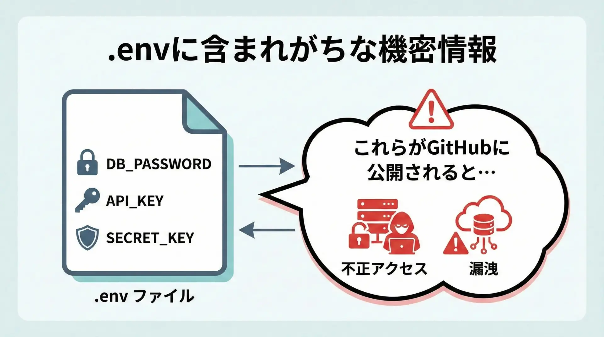 特にPythonではAPIキーやパスワードを.envファイルで管理するケースが多く、この扱いを誤るとセキュリティ事故につながります。