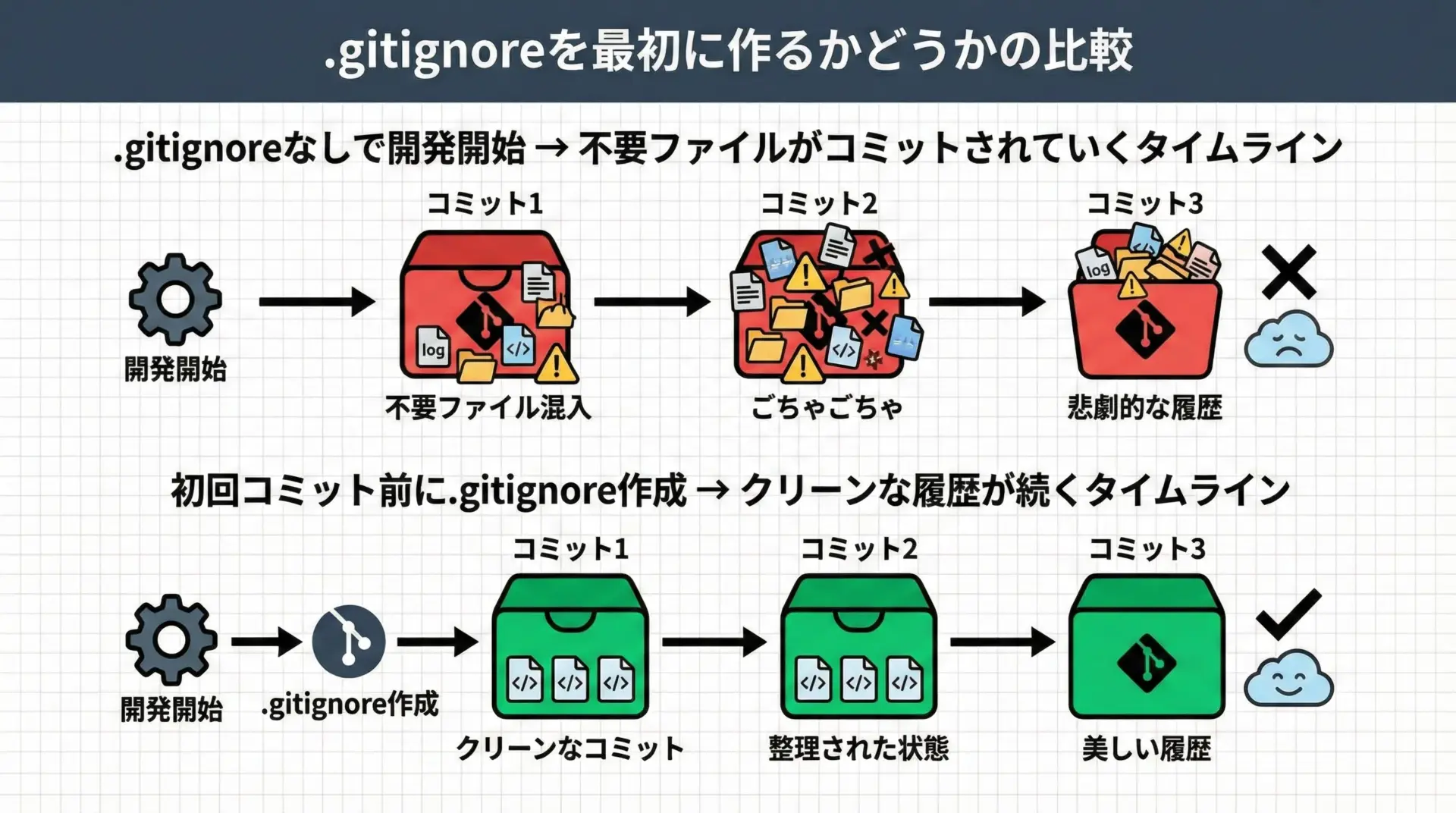 .gitignoreを適切に整備することで、これらをGitの管理対象から外し、履歴をクリーンに保つことができます。
