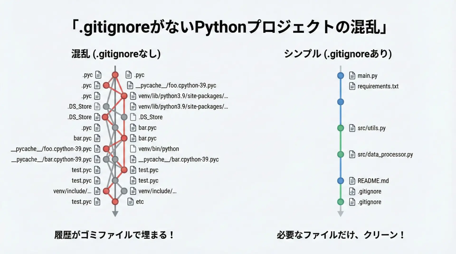 Pythonで開発をしていると、気がつけば大量の不要ファイルがGitに含まれていて、履歴が見づらくなってしまうことがあります。