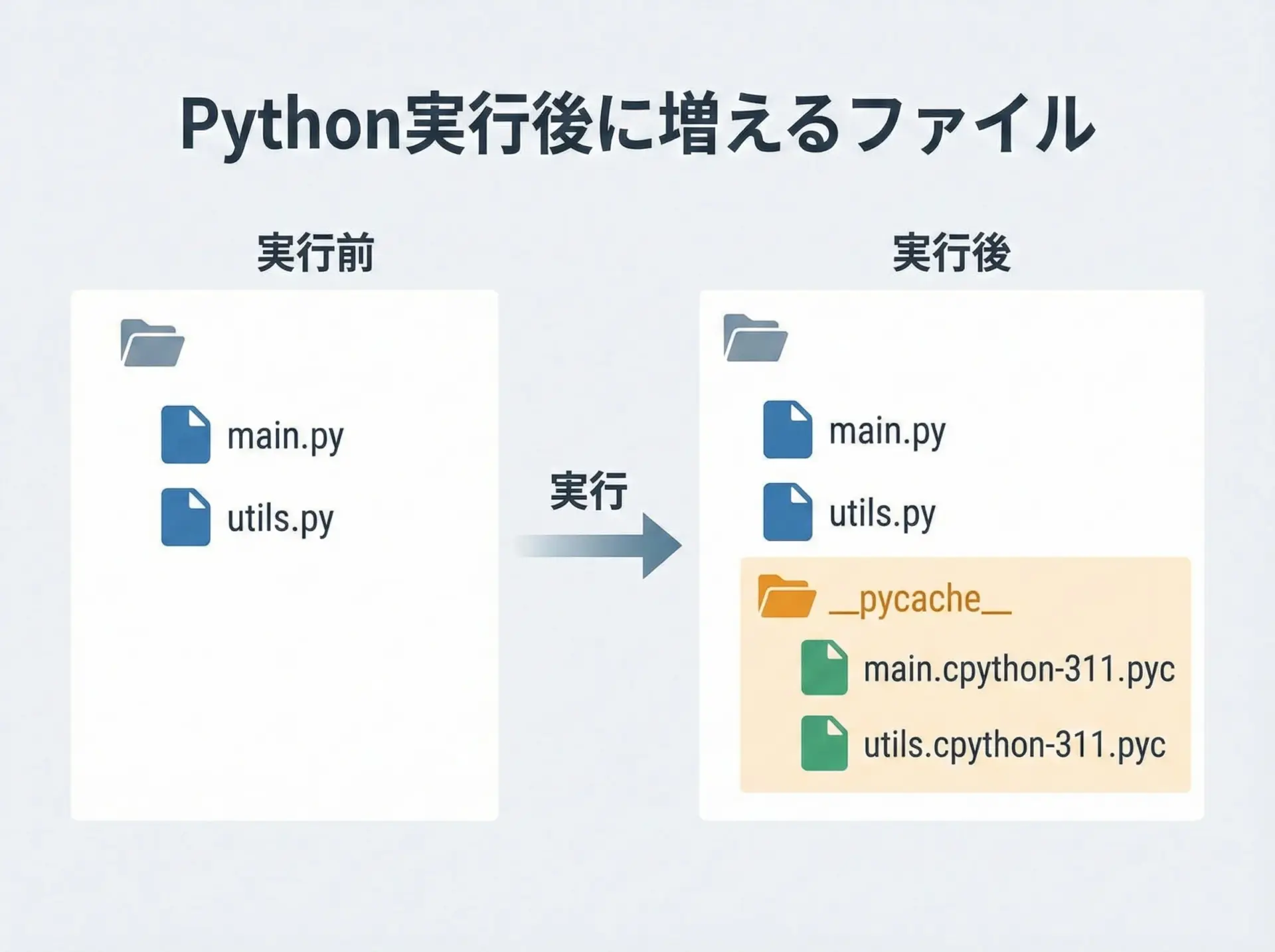 Pythonファイルを実行すると、パフォーマンス向上のために.pyc形式のバイトコードファイルが__pycache__ディレクトリに自動生成されます。