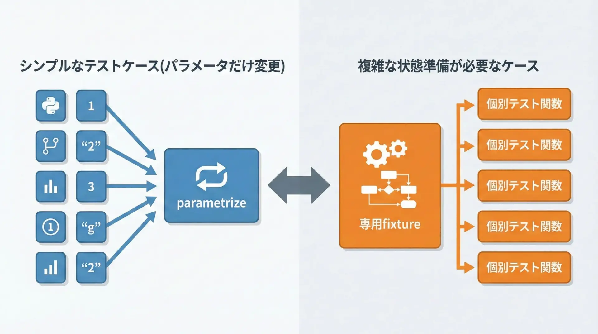 - 大量のモック設定や複雑な前処理が必要なケース → 個別テスト関数や専用fixture