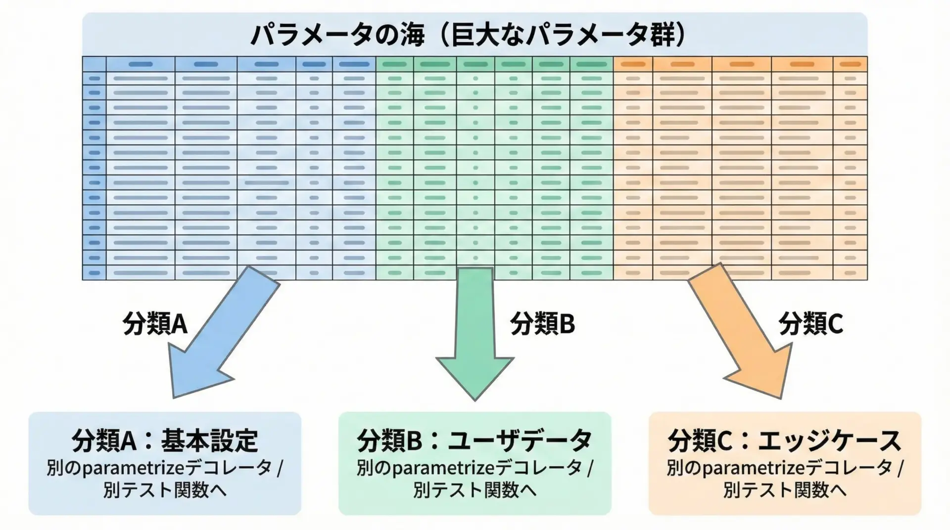 parametrizeは便利ですが、テストケースをどんどん追加していくと「1つのテスト関数に数百ケースがある巨大テーブル」になってしまうことがあります。