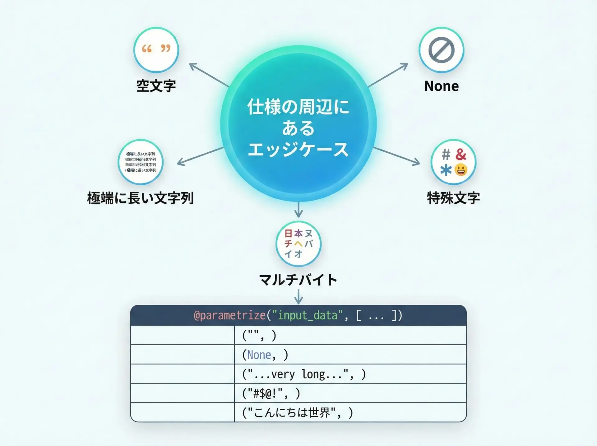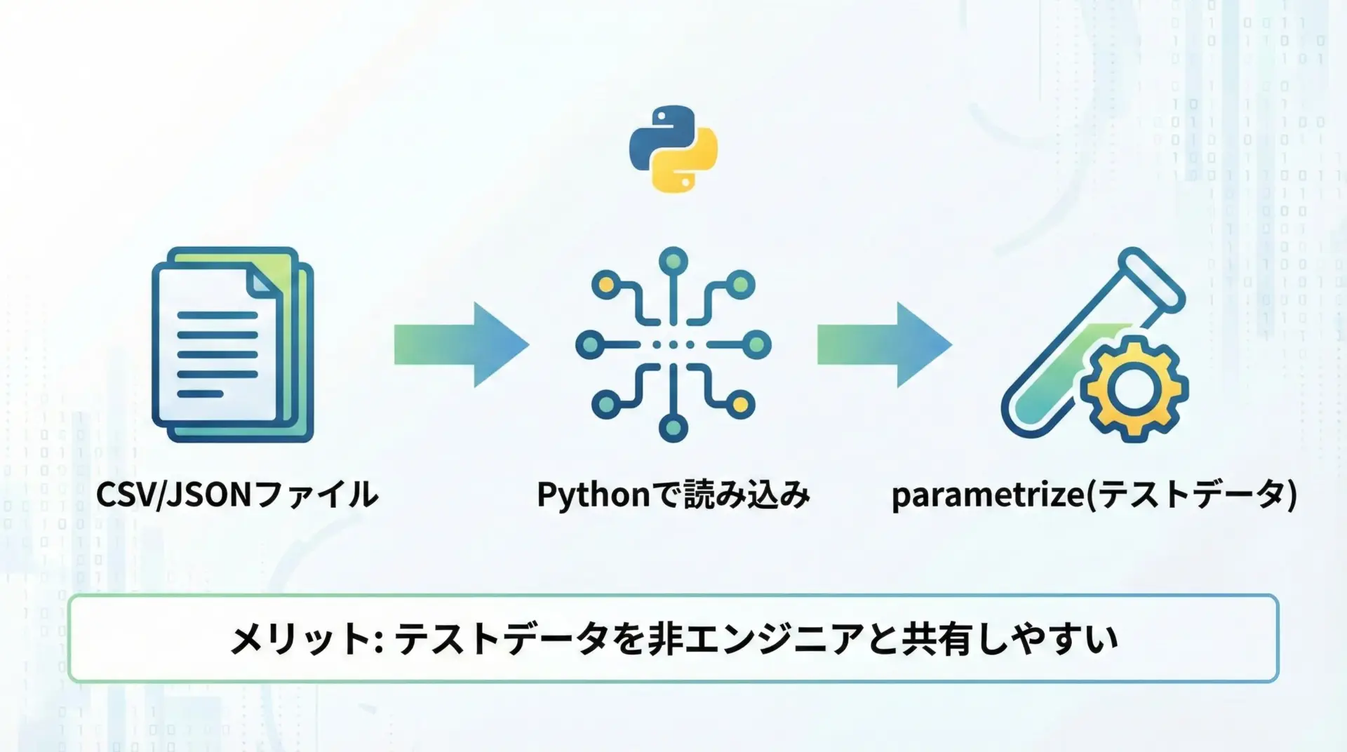 pytestの@pytest.mark.parametrizeは、テストロジックを1カ所に集約し、テストデータをテーブルとして整理できる強力な仕組みです。