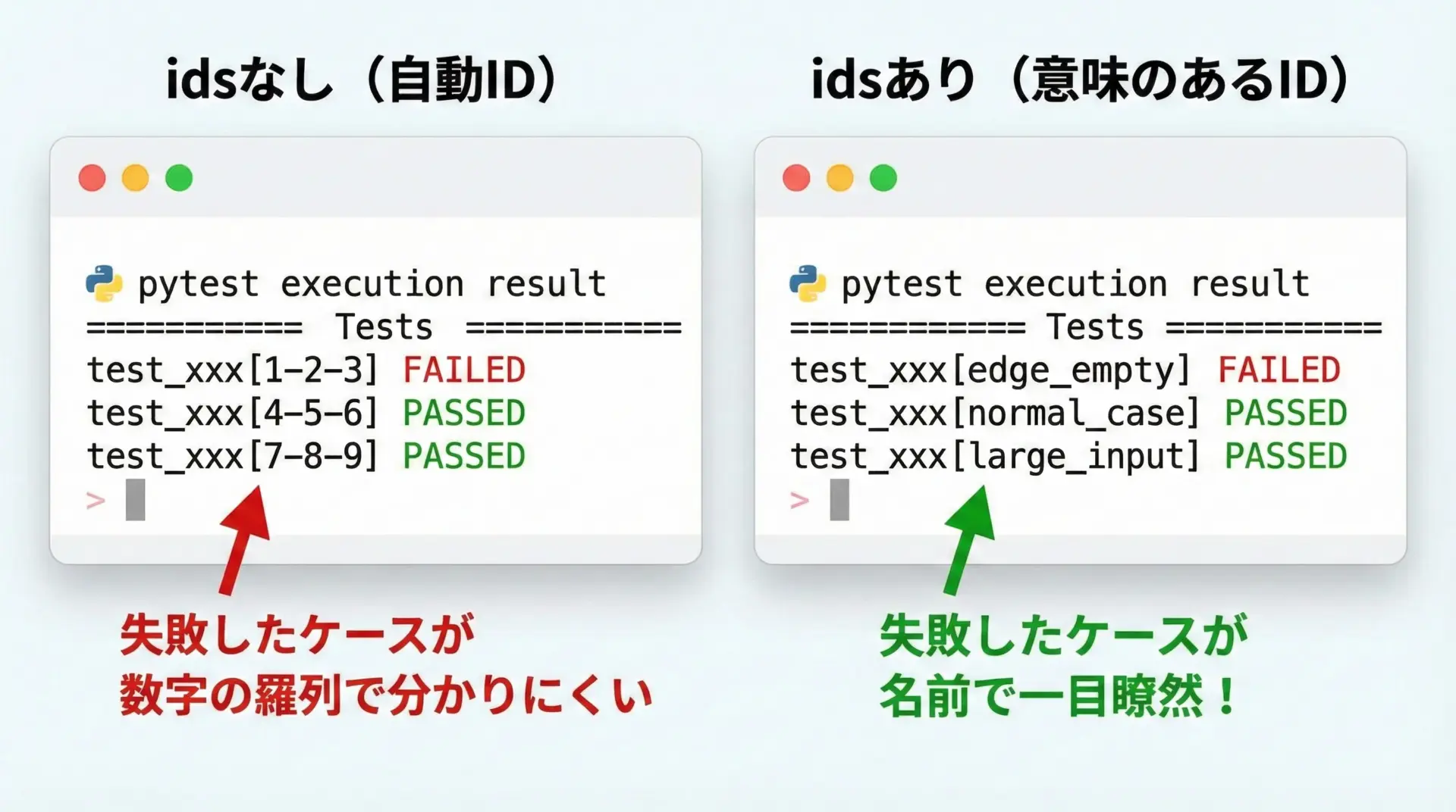 ここではテストケースごとのIDを明示していませんが、pytestは自動的にvalue0、value1といった形で識別して報告してくれます。