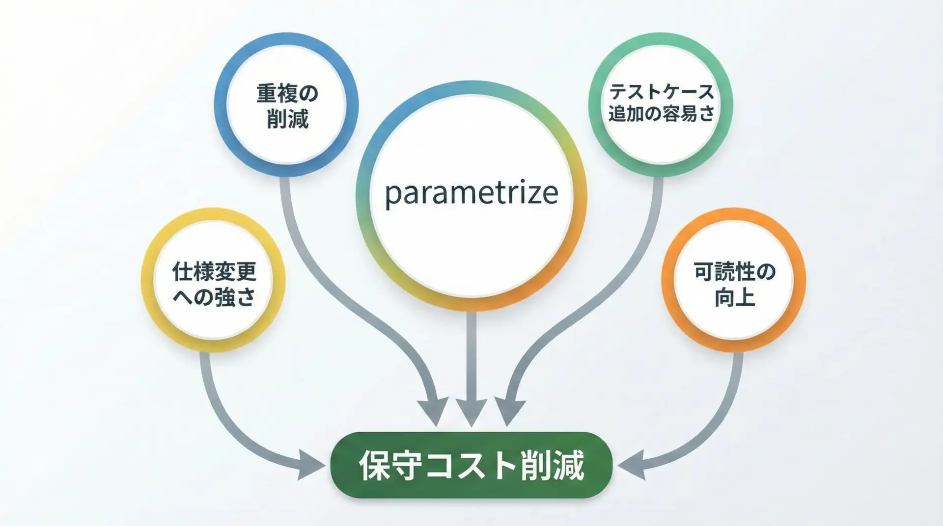 pytest parametrizeがテスト自動化に特に有効な理由は、単に「書く量が減る」以上の効果があるためです。