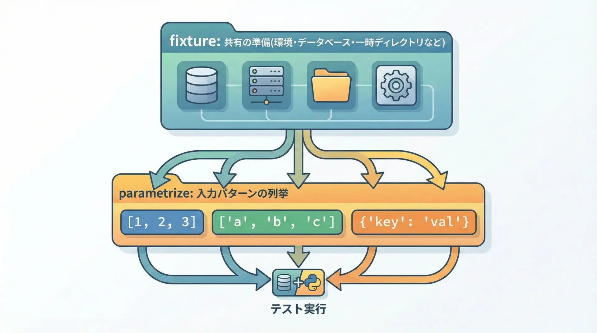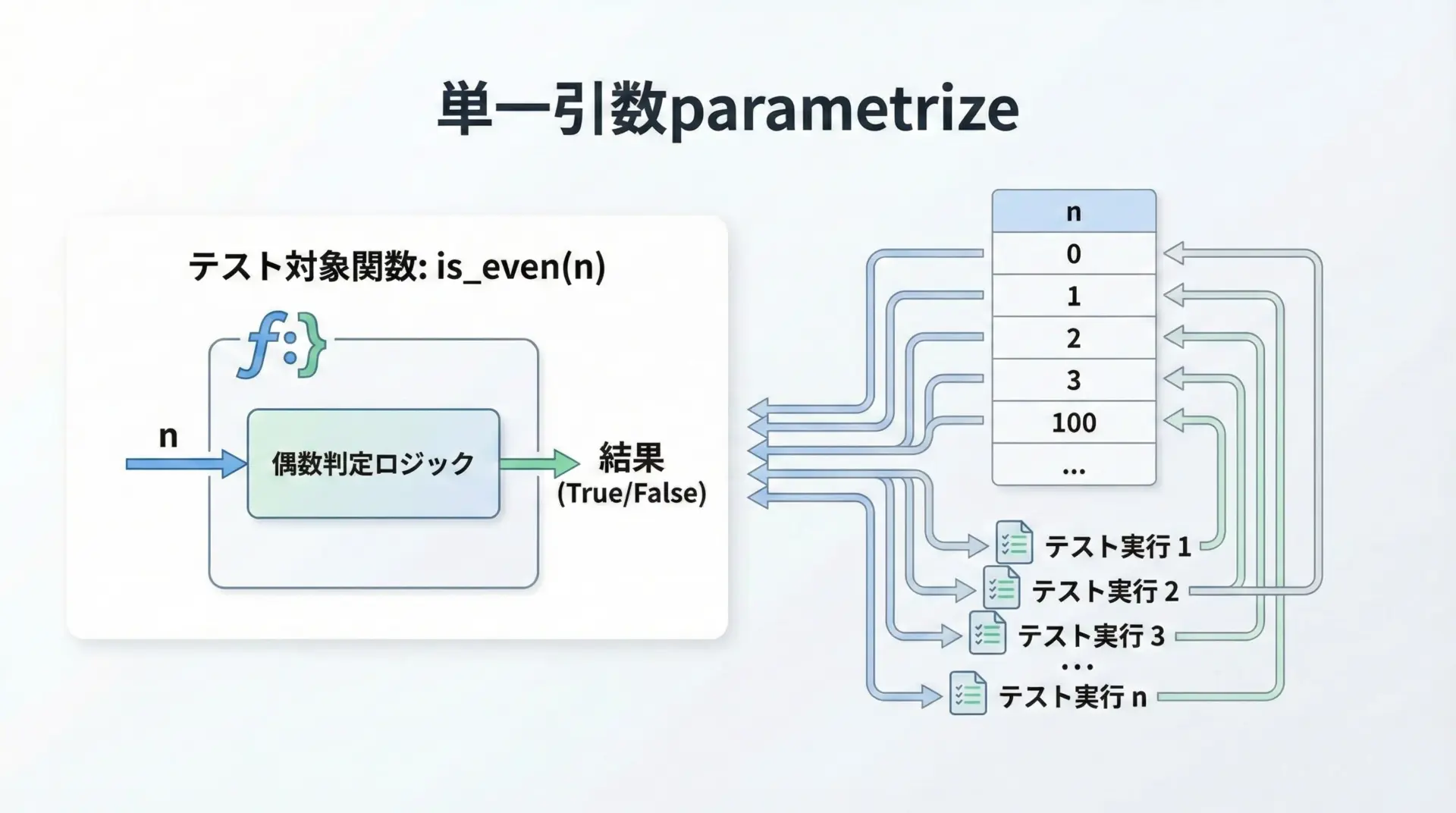 pytestのparametrizeは、1つのテスト関数に対して複数の入力値と期待値(テストケース群)を与え、同じテストロジックを繰り返し実行するための仕組みです。