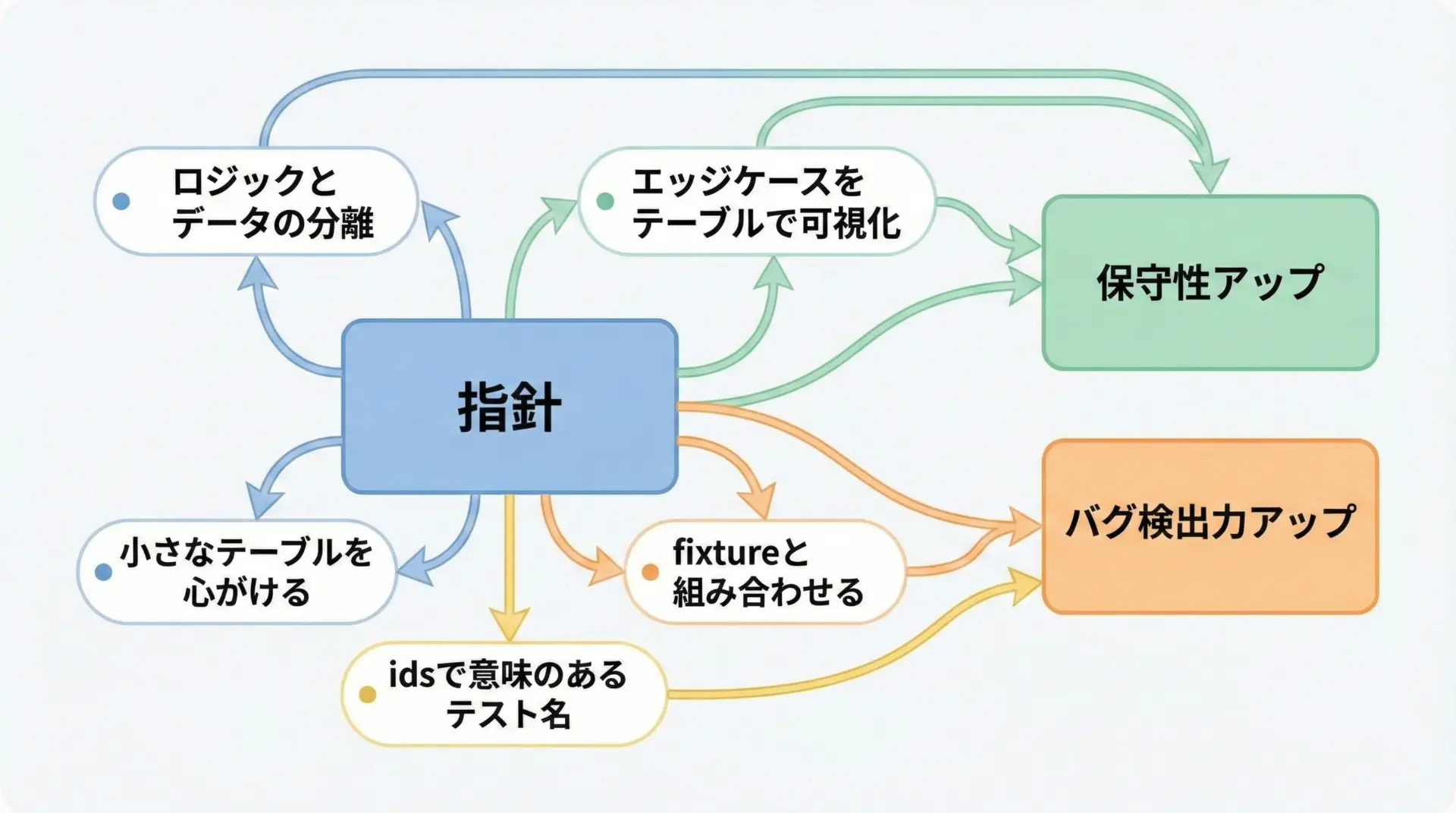 pytest parametrizeを使いこなすための指針を整理すると、次のようになります。