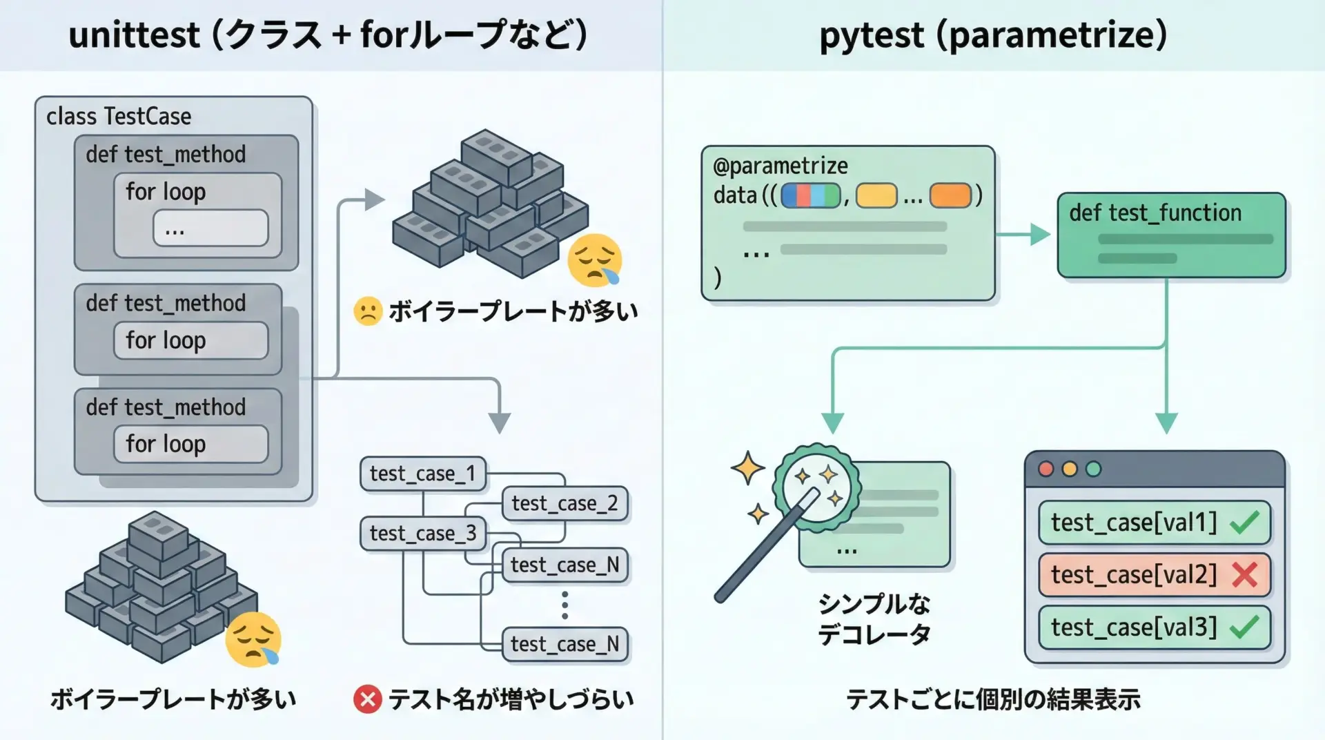 一方でpytestのparametrizeは@pytest.mark.parametrizeというデコレータ1つで表現でき、テストケースごとに独立したテストとしてレポートされるため、失敗したケースの特定も容易です。