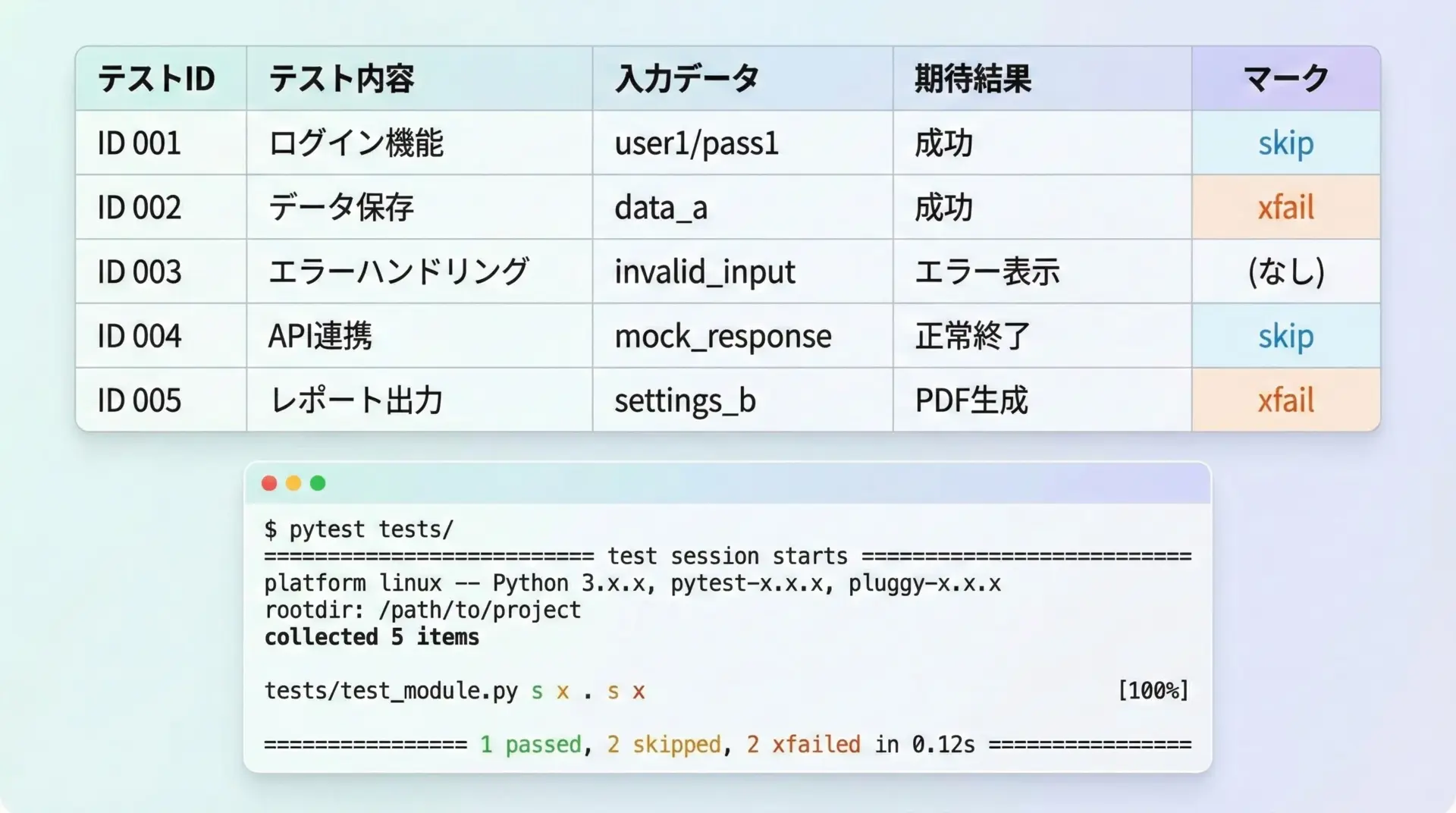 さらに、fixtureやids、xfail・skipなどの機能と組み合わせることで、現実的な開発現場のニーズに即した、柔軟かつ読みやすいテストスイートを構築できます。