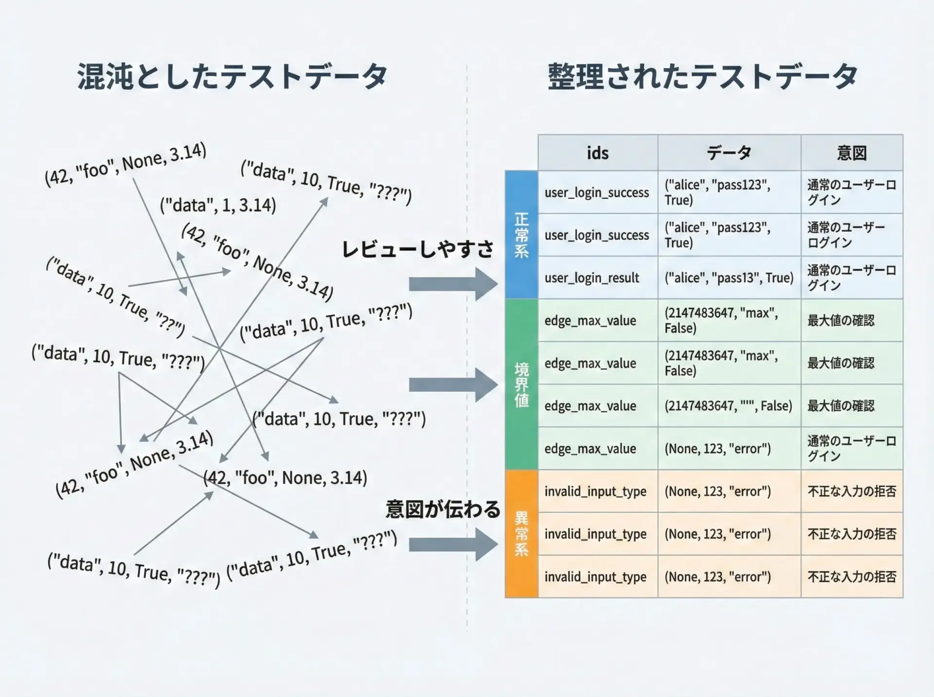 「これはどんな条件をテストしているのか」が読み手に一目で伝わるように、テーブルを整理することが長期的な保守性につながります。