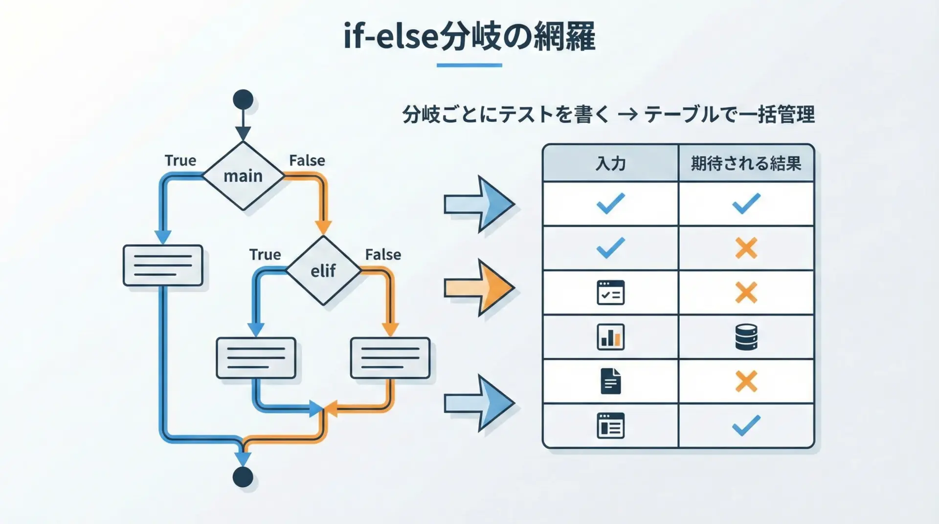 この考え方は、いわゆる「テーブル駆動テスト」と呼ばれるスタイルに非常に近く、テスト対象の仕様変更やテストケース追加にも柔軟に対応しやすくなります。