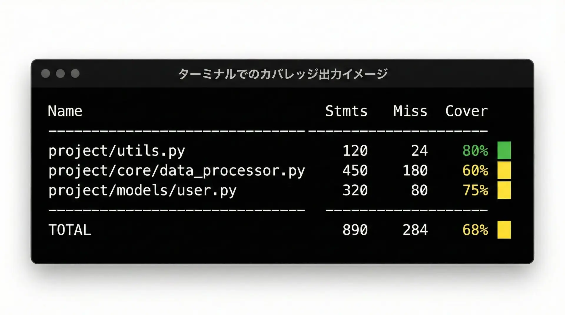 この出力については、後ほど「ターミナルでのカバレッジレポート表示」で詳しく説明します。