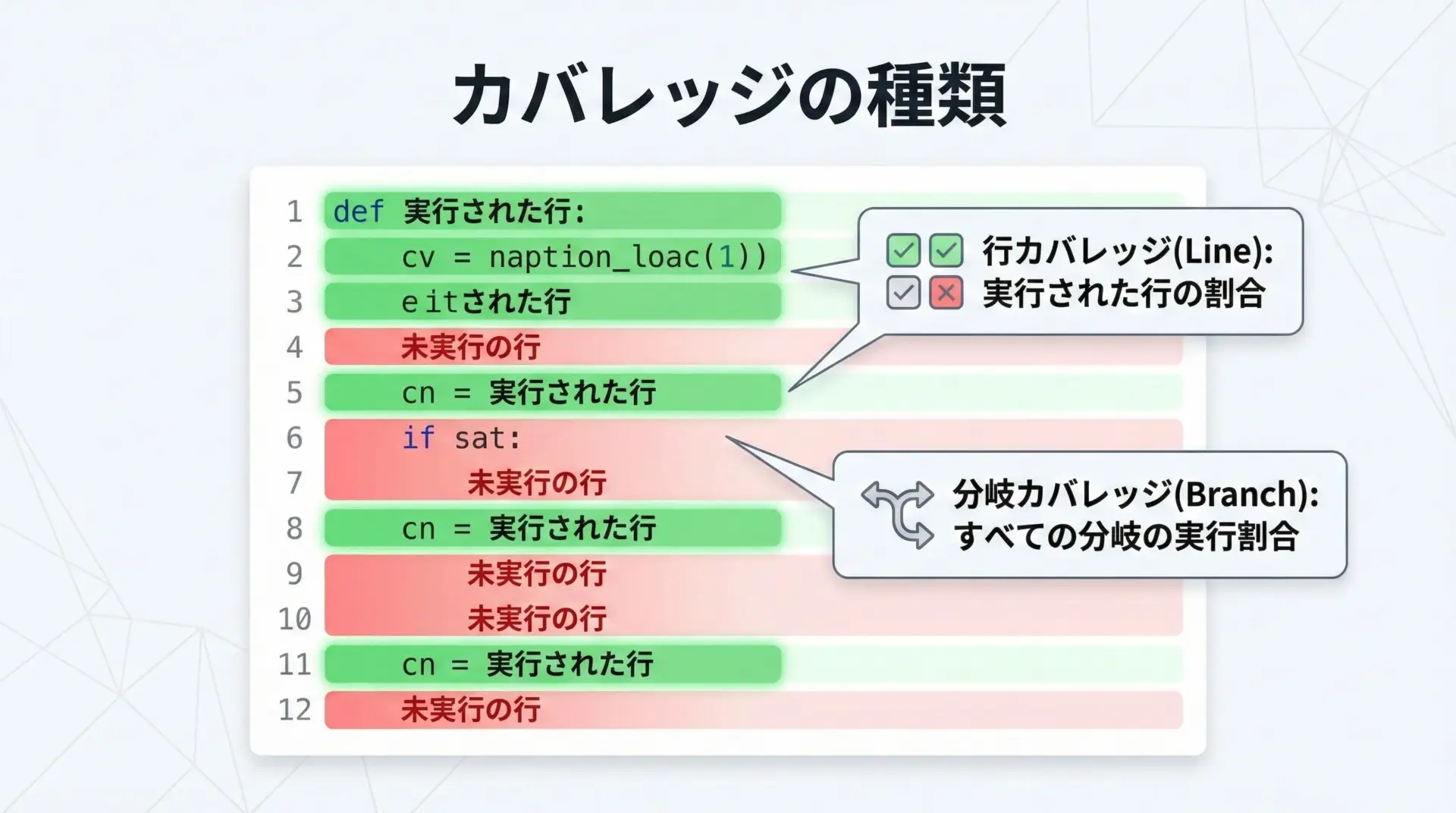 pytest-covでは主に行カバレッジ(Line Coverage)を扱いますが、coverage.pyの設定によっては分岐カバレッジなども計測可能です。