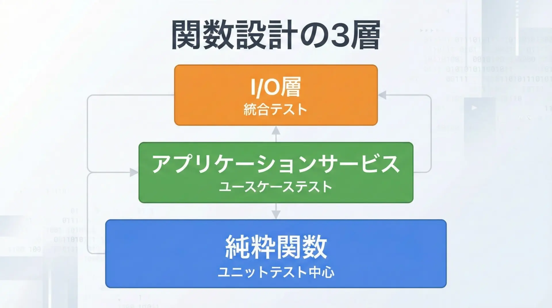 こうした分割により、ユニットテストの対象(純粋関数)と統合テストの対象(I/O層)を明確に分離できます。