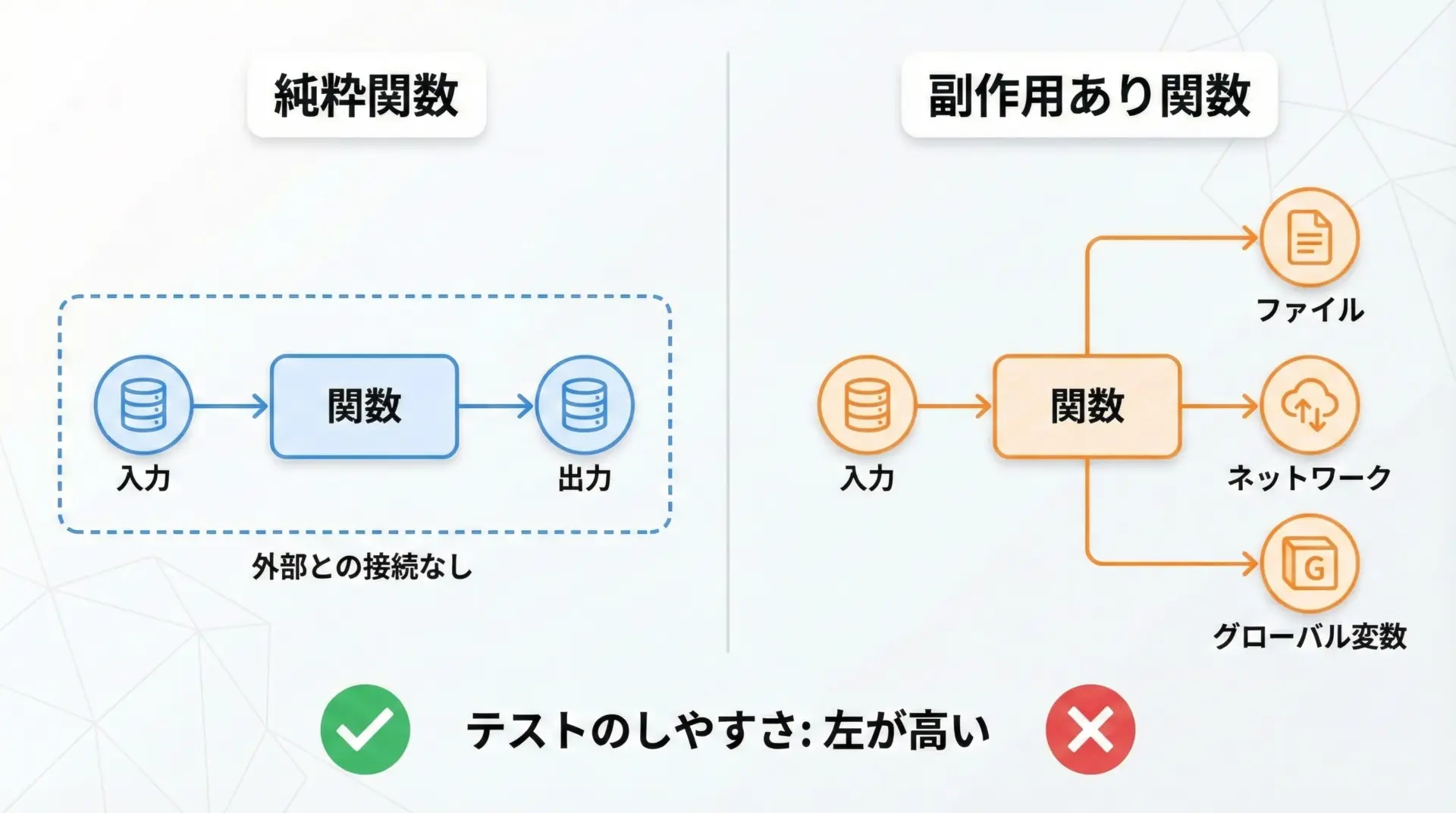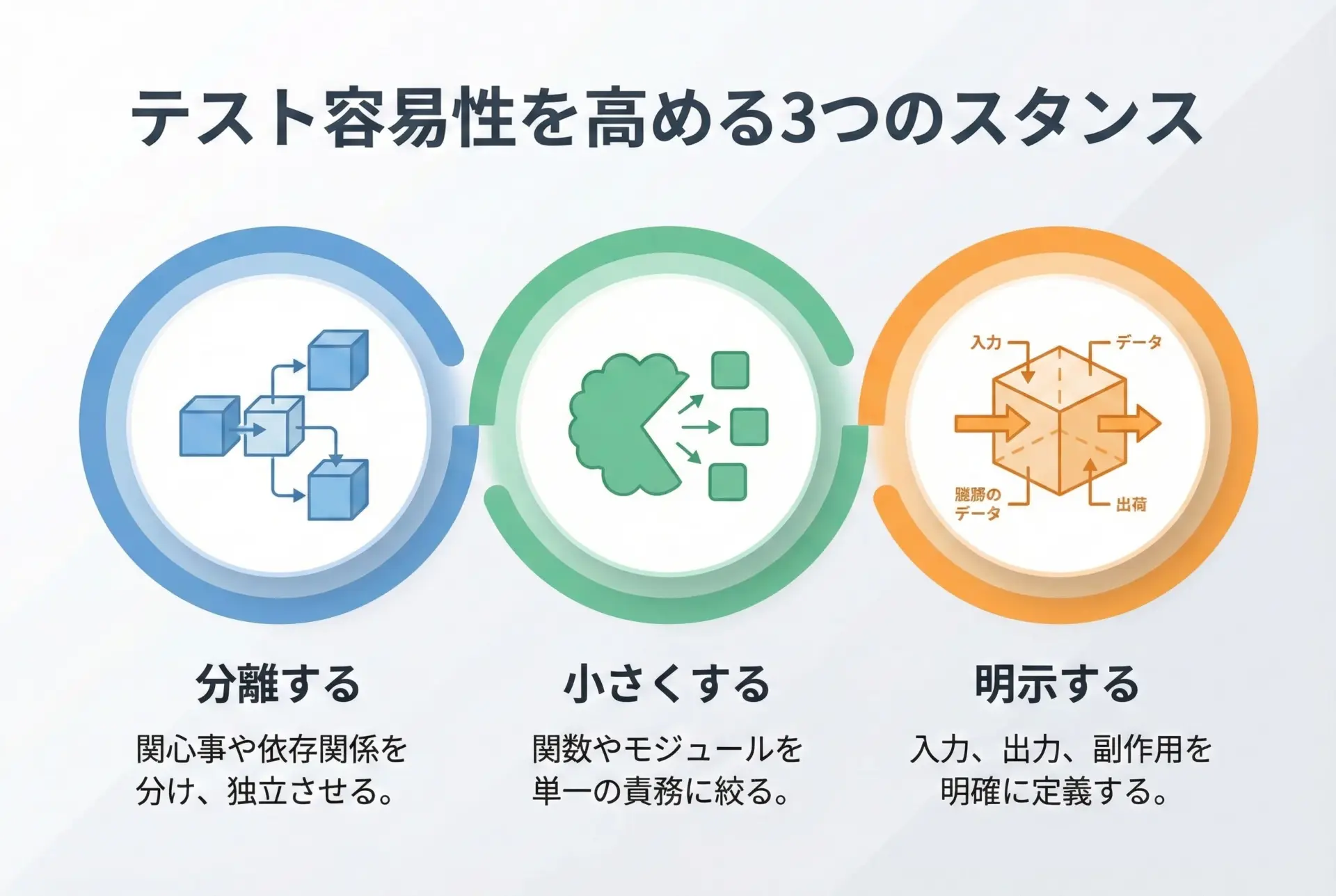 関数の入力・出力・例外・副作用・依存関係などを、暗黙ではなく明示することで、テストで何を確認すべきかが明確になります。
