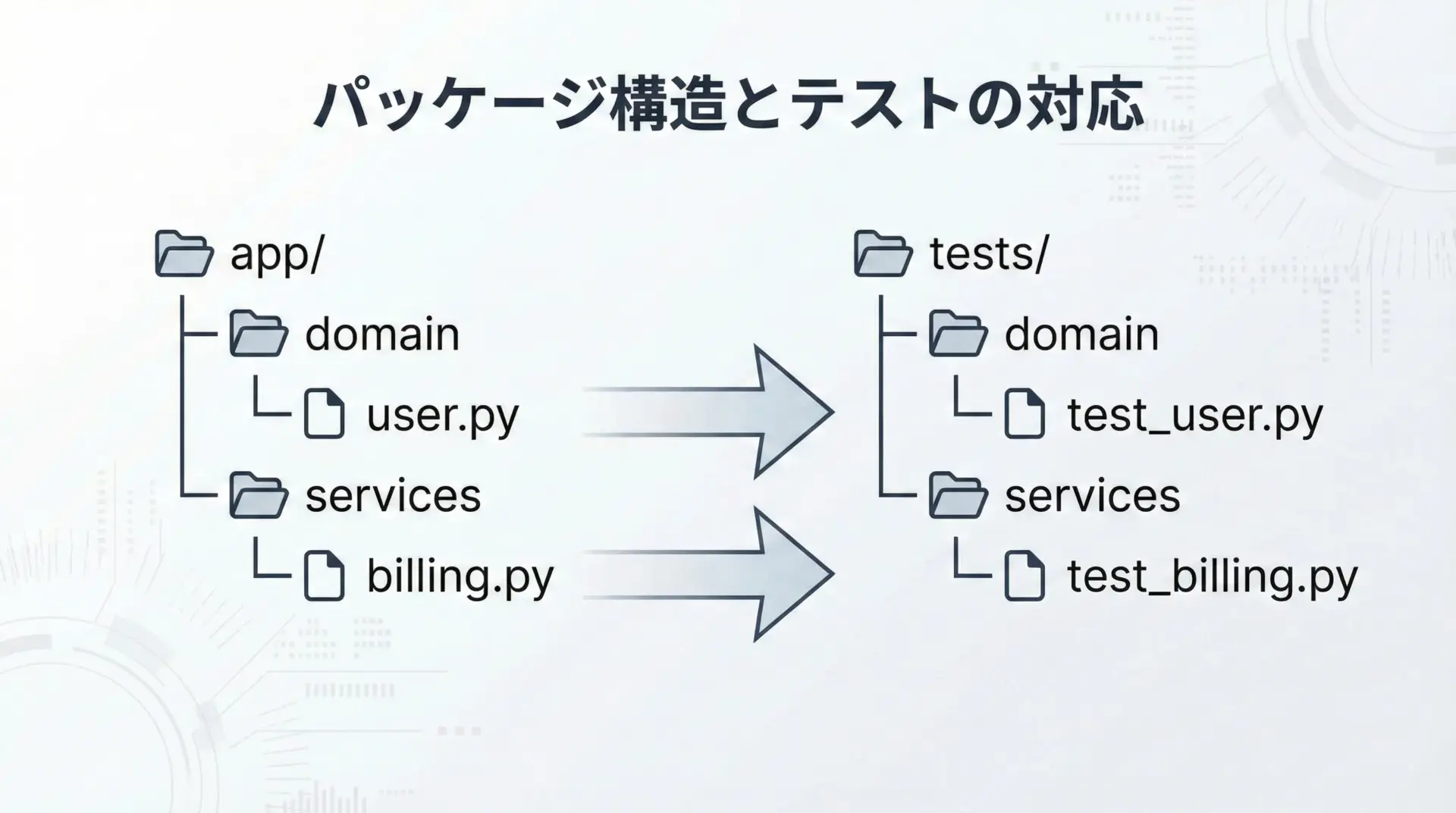 テスト側では、domainはユニットテスト、servicesはモックを使ったユースケーステスト、infraは統合テストといったレイヤごとのテスト戦略が立てやすくなります。