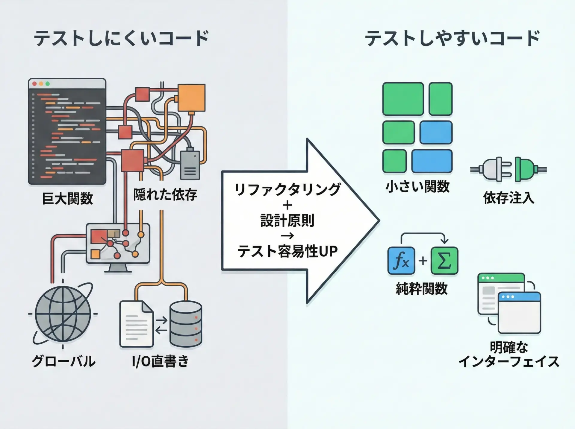 単一責任原則や依存関係逆転原則といった設計原則をベースに、依存の注入・純粋関数の活用・設定値とロジックの分離などを組み合わせることで、初めてテスト容易性が高いコードになります。