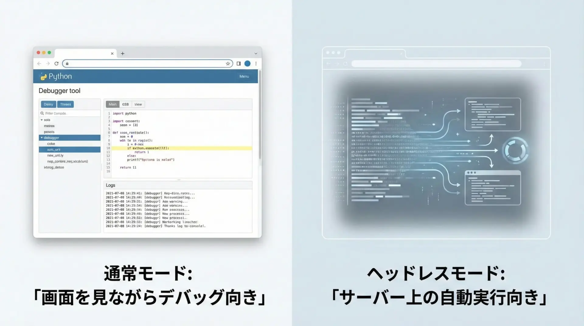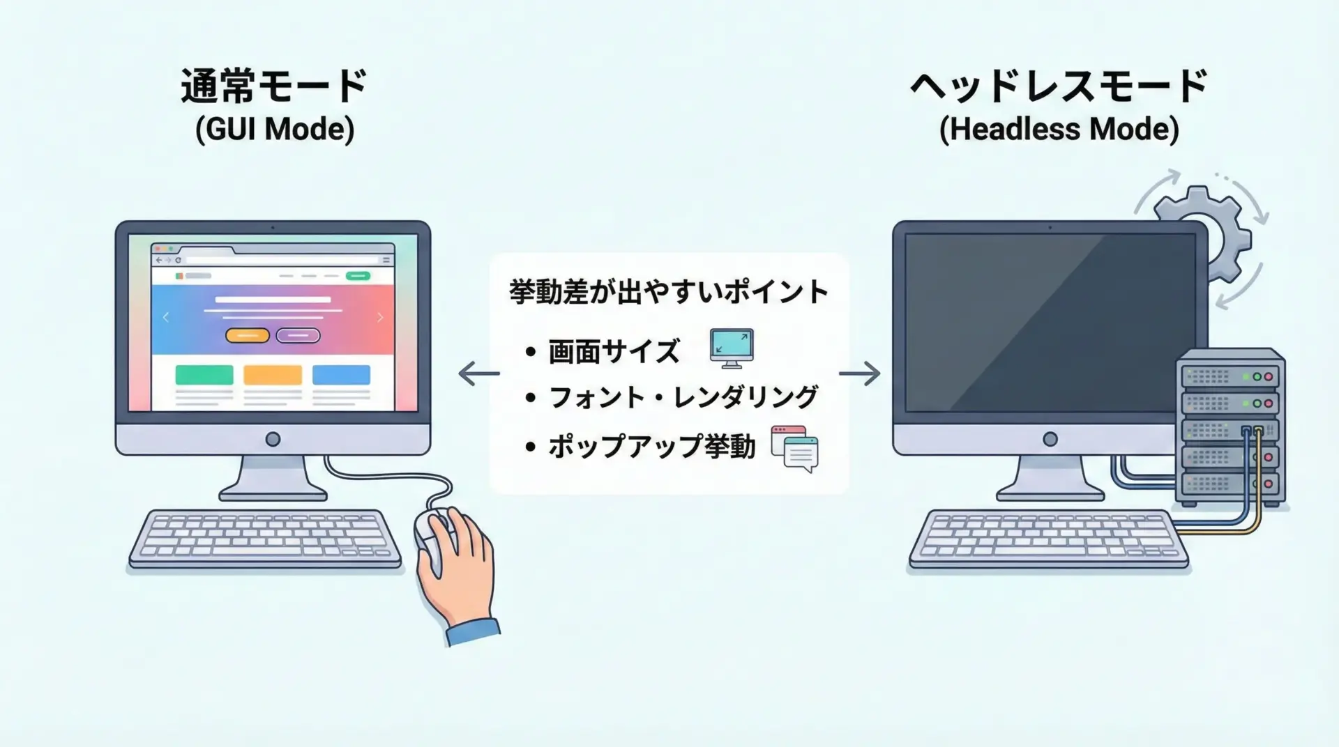 「開発時は通常モード、運用時はヘッドレス」という切り替え方を意識しておくと、トラブルに対応しやすくなります。