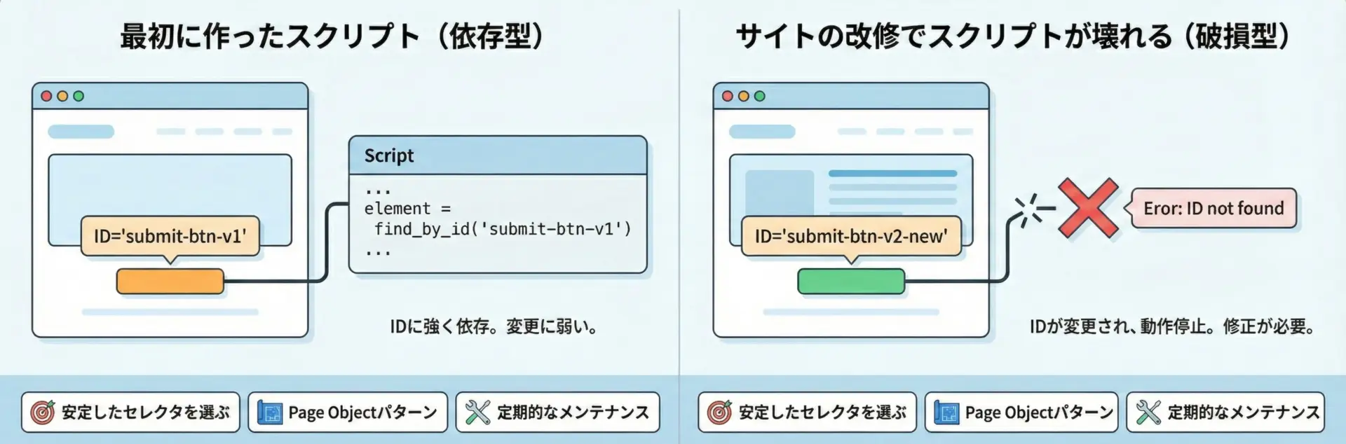 「サイトは変わる前提で、自動化コードもメンテナンスするもの」と捉え、セレクタ設計を工夫しておくことが長期運用の鍵になります。