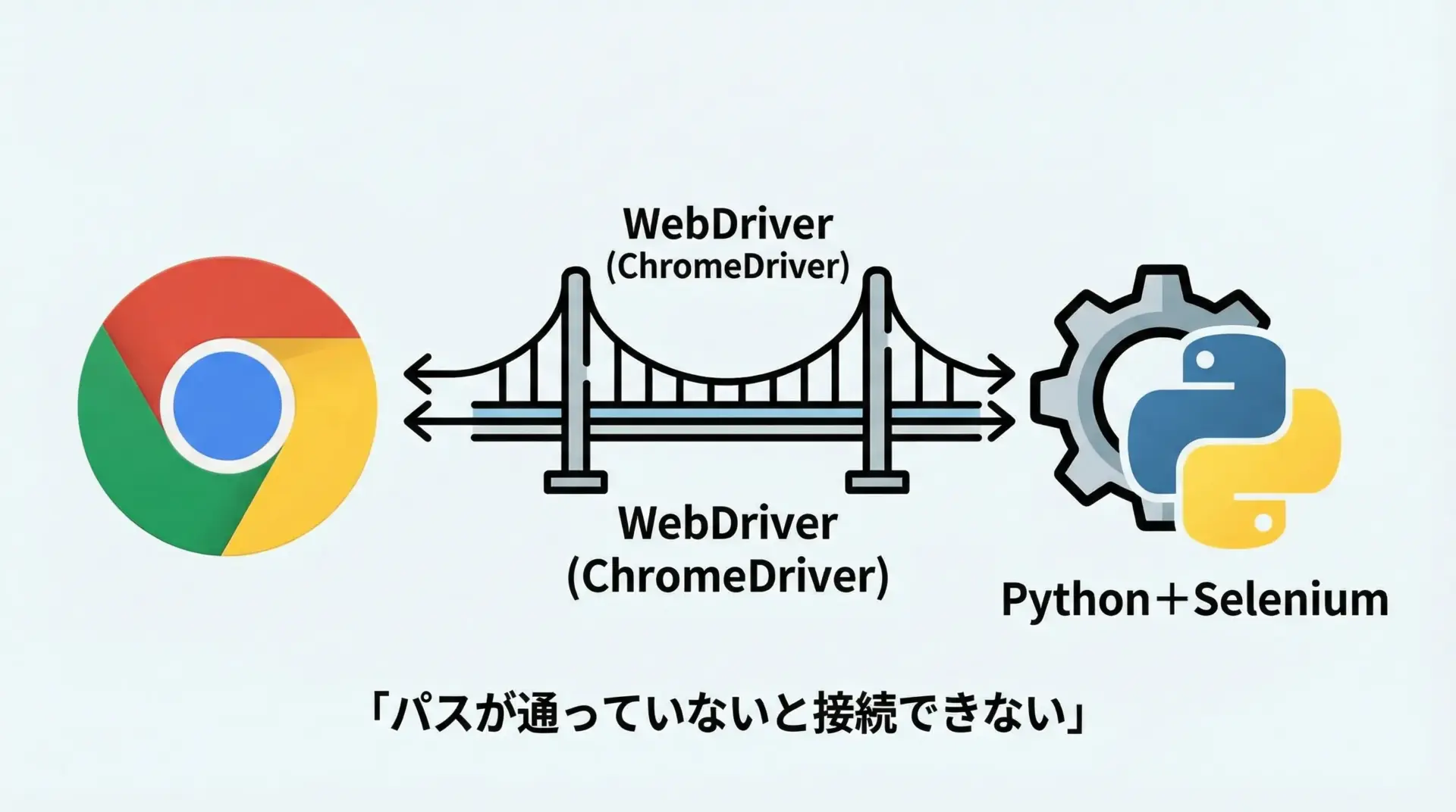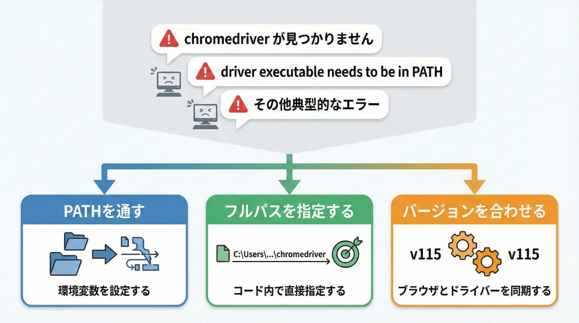 → OSの環境変数PATHにChromeDriverを置いたフォルダを追加するか、webdriver.Chrome(executable_path="...")のようにフルパスを指定します。 - Chrome本体がインストールされていない、または場所が特殊