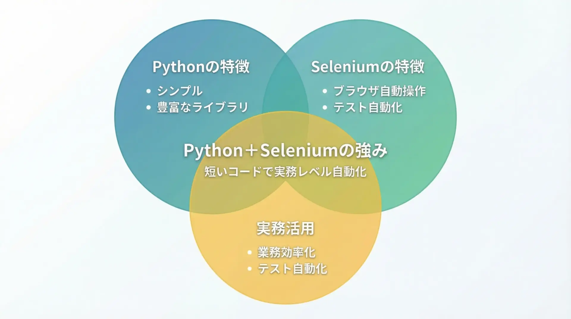 SeleniumでWebから情報を取得し、その結果をすぐに他の処理と組み合わせられるので、ブラウザ操作だけで完結しない実務レベルの自動化がしやすいのが大きな強みです。