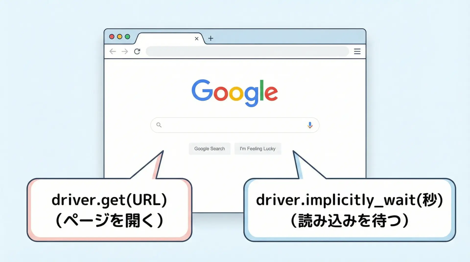 このコードではdriver.get()でURLを開き、time.sleep(5)で単純に5秒間停止しています。