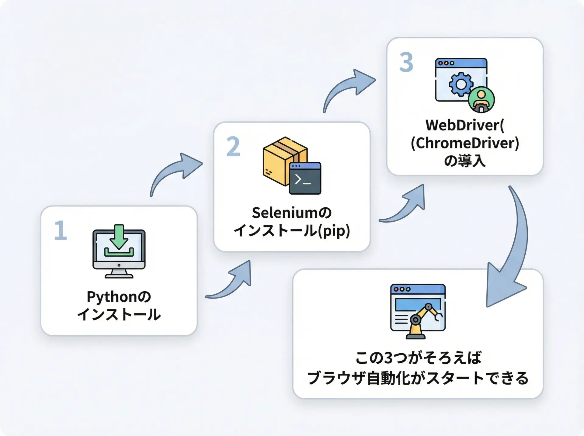 PythonでSeleniumを動かすには、最低限次の3つの環境が必要です。