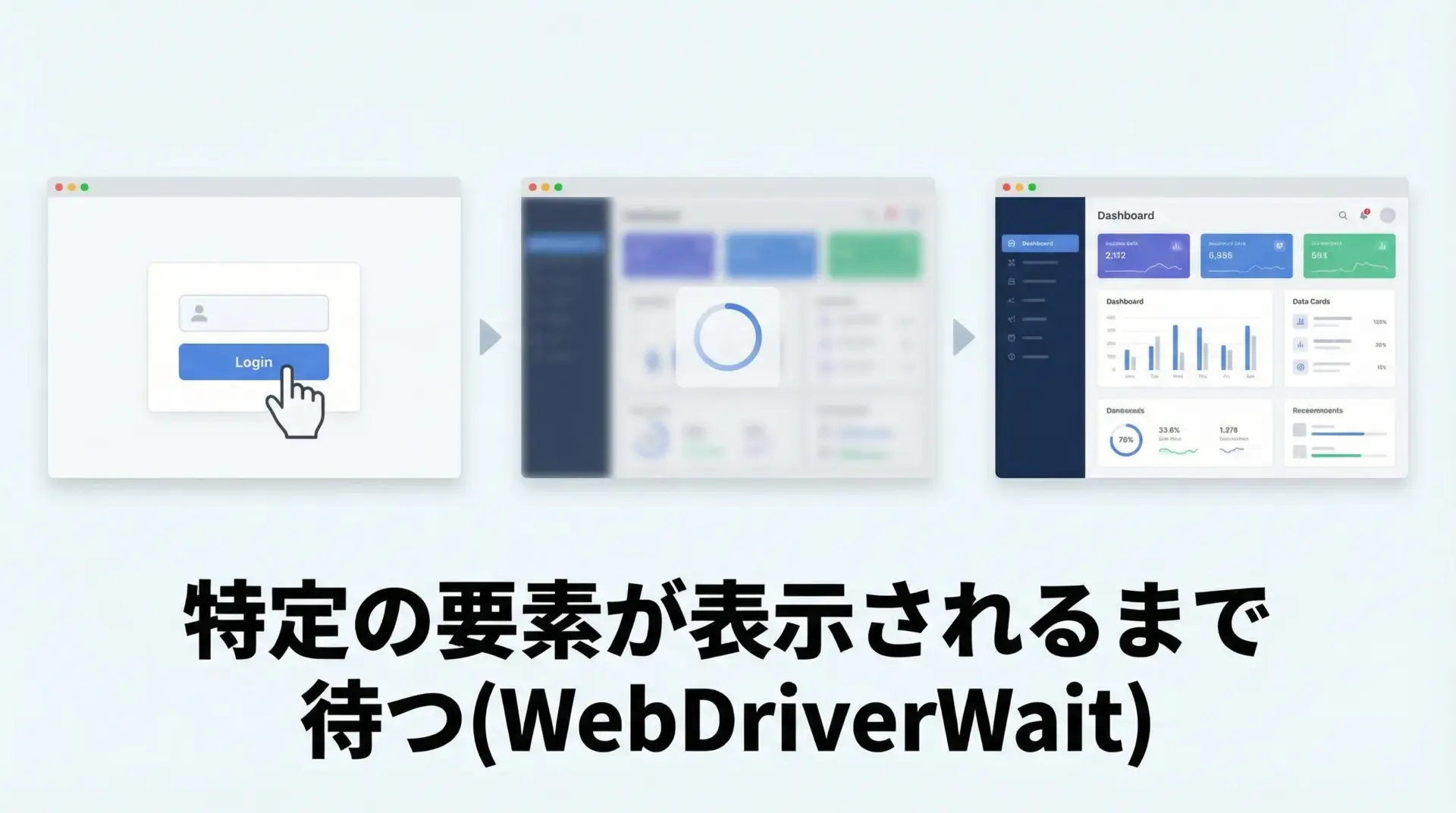 こちらは「ある条件が満たされるまで待機する」という仕組みで、要素が表示された瞬間に次の処理に進めるため、柔軟かつ効率的です。