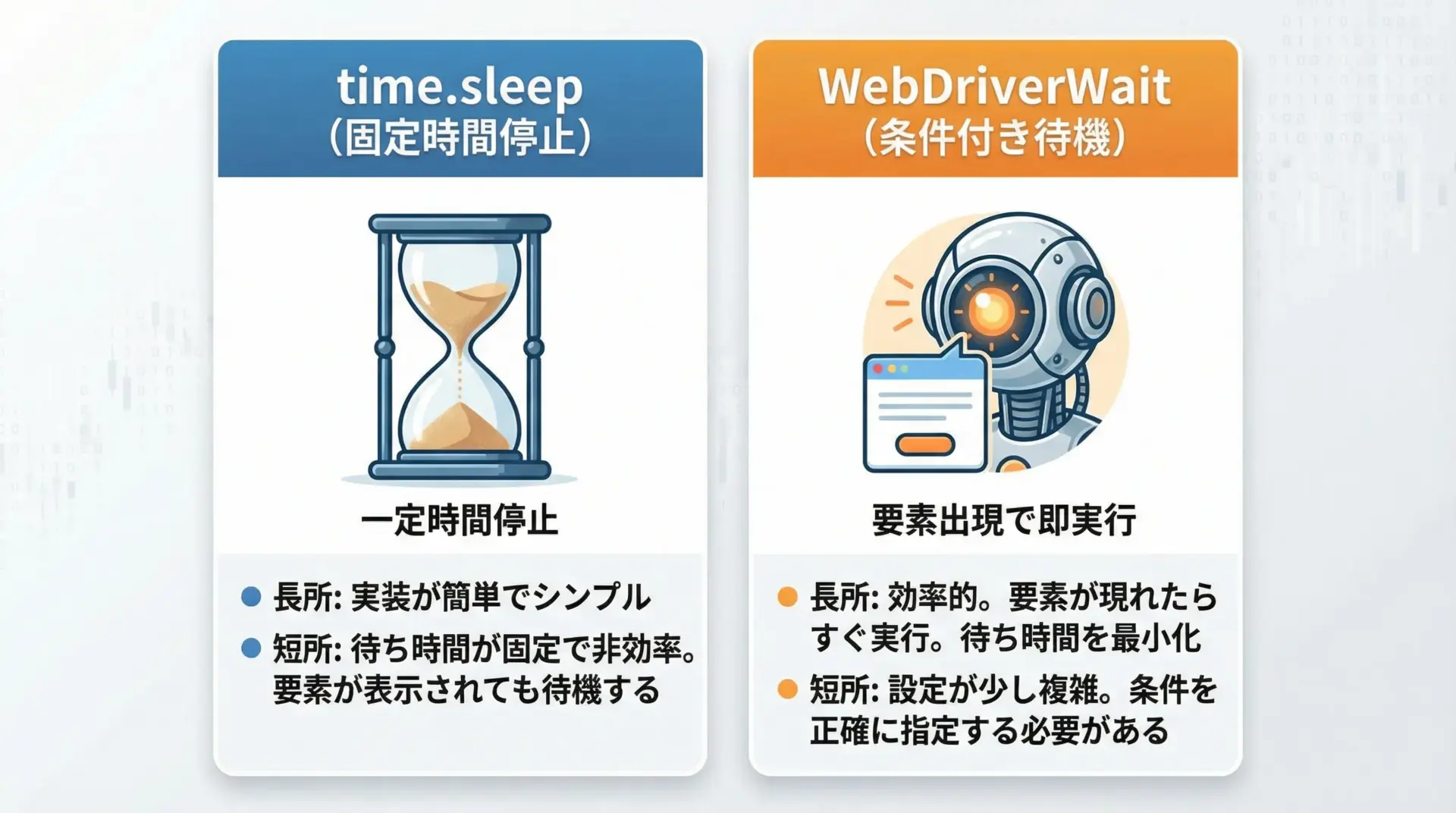 用途としては、開発中や検証時にはtime.sleepでざっくり動きを確認し、本格的な運用ではWebDriverWaitに置き換えていく流れが実務では多いです。