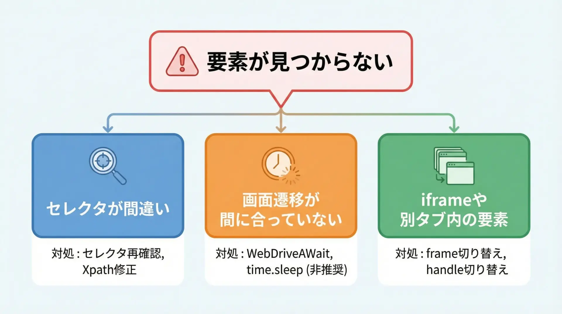 クリック直後やページ遷移直後に要素を取りに行くと、まだDOMに存在していないことがあります。この場合はWebDriverWaitを使って、要素が現れるまで待つようにします。 - iframeやポップアップ内の要素を探している