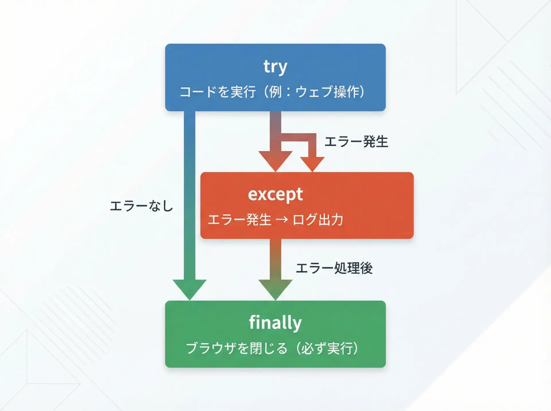 このようにしておけば、たとえ予期しないエラーが起きてもブラウザプロセスをきちんと終了させることができます。