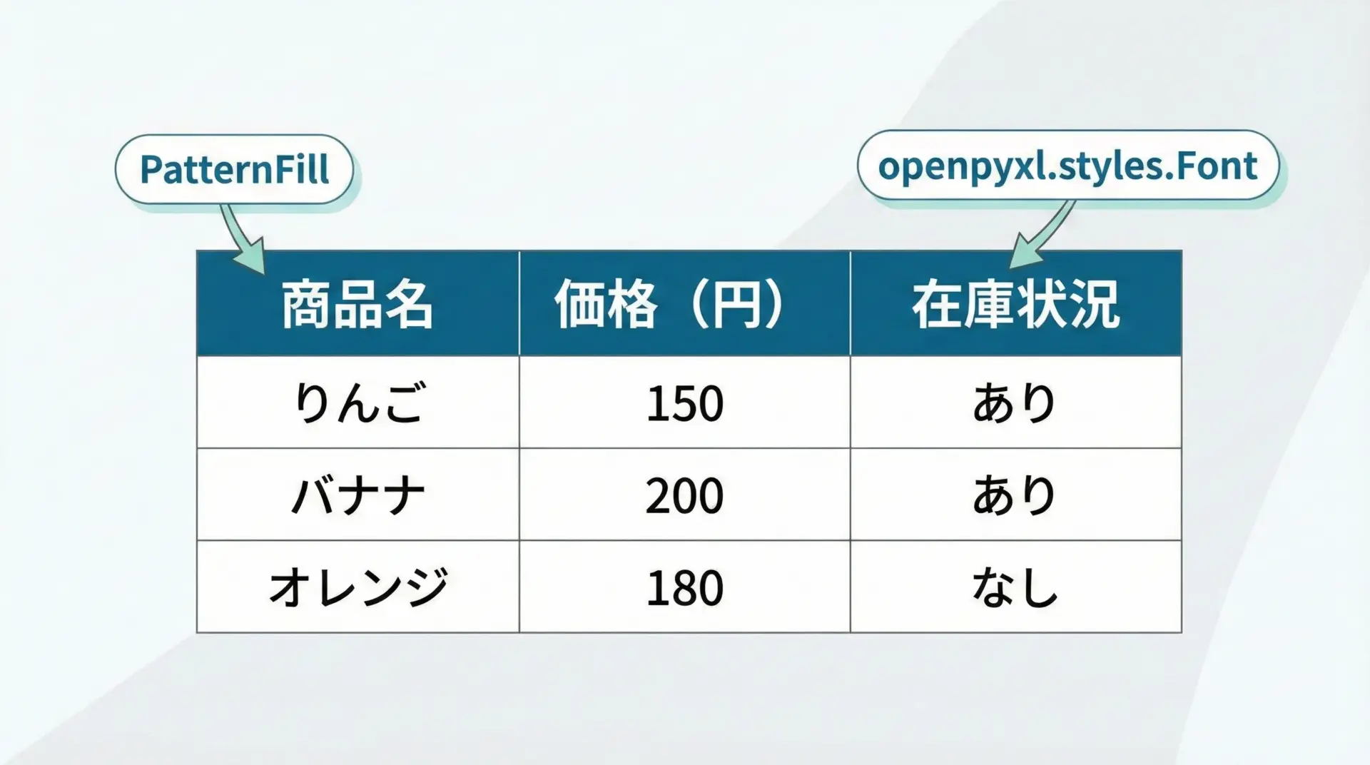 openpyxlでは、フォント・色・罫線・塗りつぶしなどの基本的な書式を設定できます。