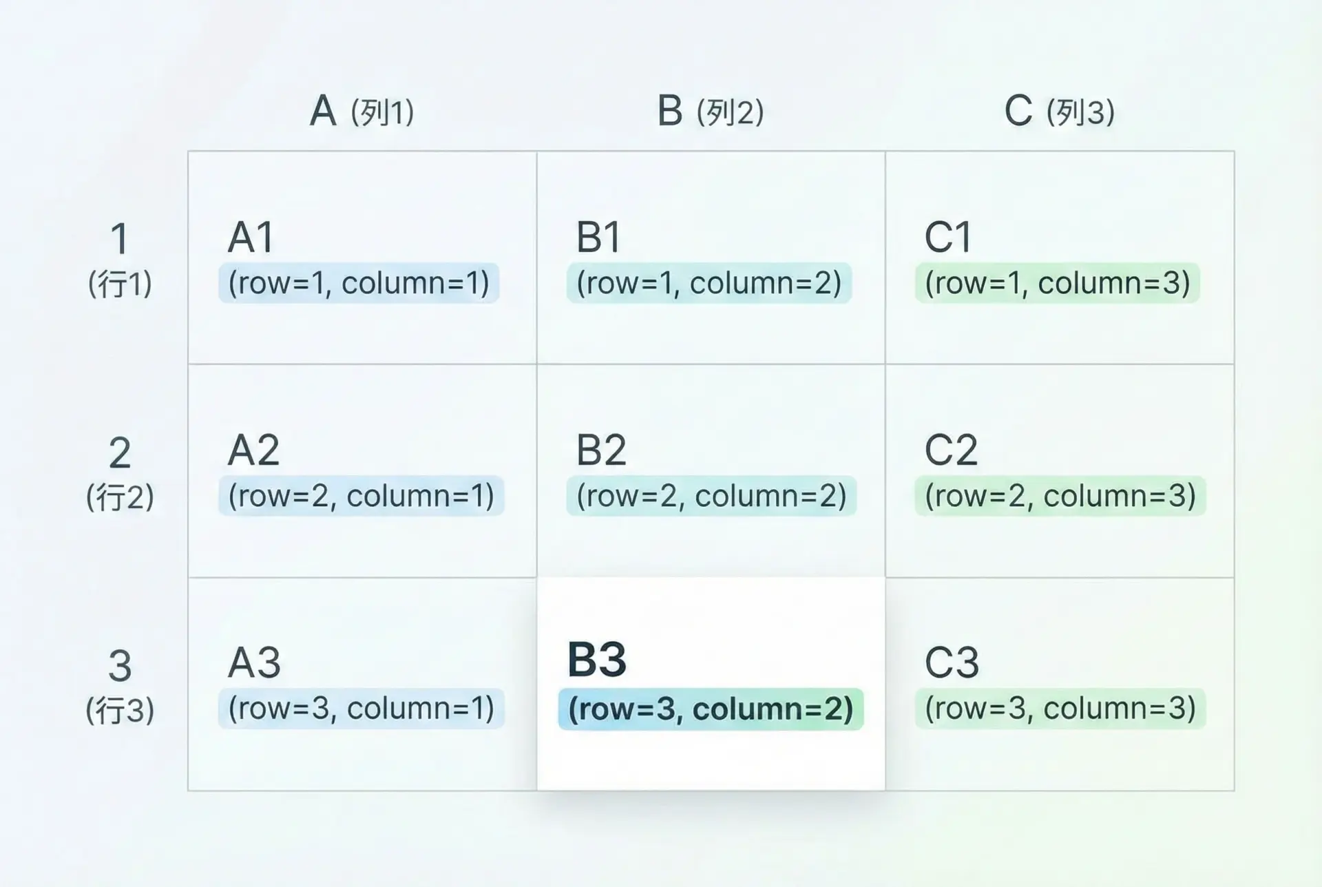 2. 行番号・列番号で指定(例: ws.cell(row=3, column=2))