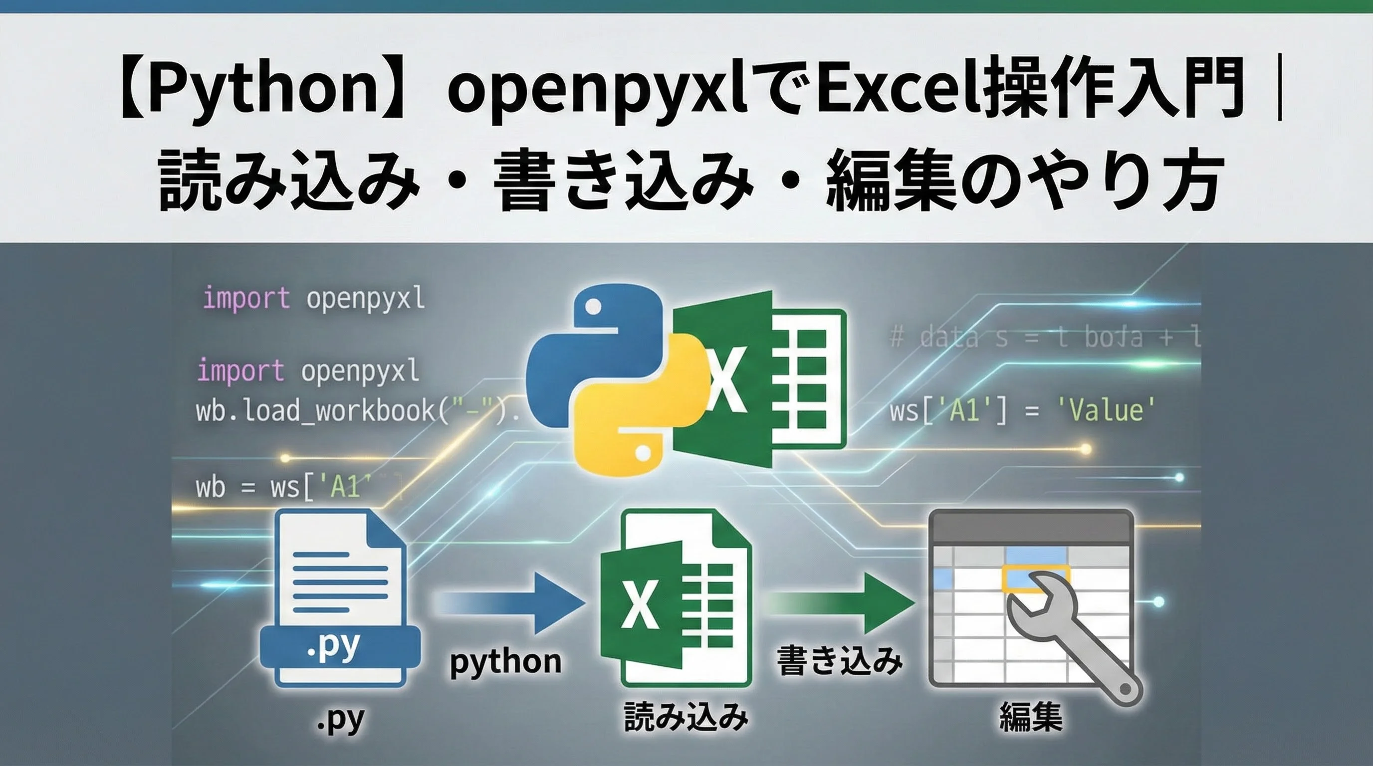 openpyxlを使うことで、PythonからExcelファイルの新規作成・読み込み・編集・保存まで一通り操作できるようになります。