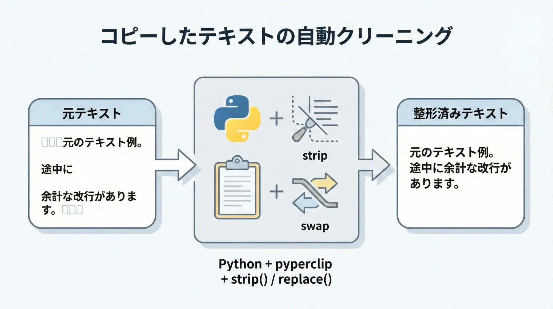 pyperclipを使うと、「コピー → 自動整形 → 整形済みを再コピー」という流れをスクリプト1本で実現できます。