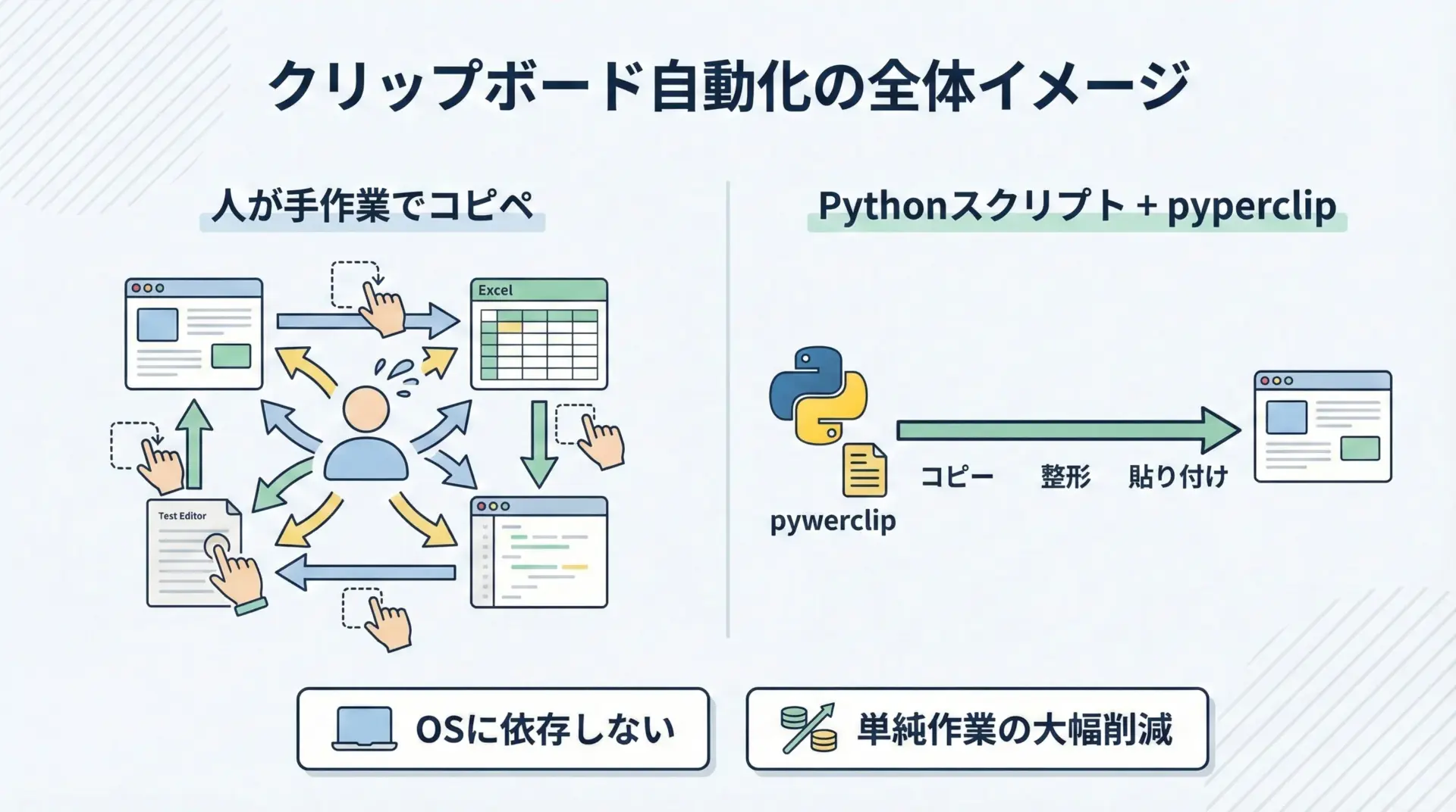 インストールはpip install pyperclipだけで済み、copy()とpaste()という2つの関数を覚えれば、クリップボードの読み書きをすぐに始められます。