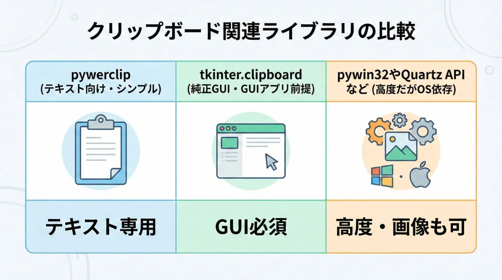 テキストだけをサクッと扱いたい場合はpyperclipが最適であり、画像やリッチテキストも含めて制御したい場合はOS固有APIを検討する、という使い分けが現実的です。