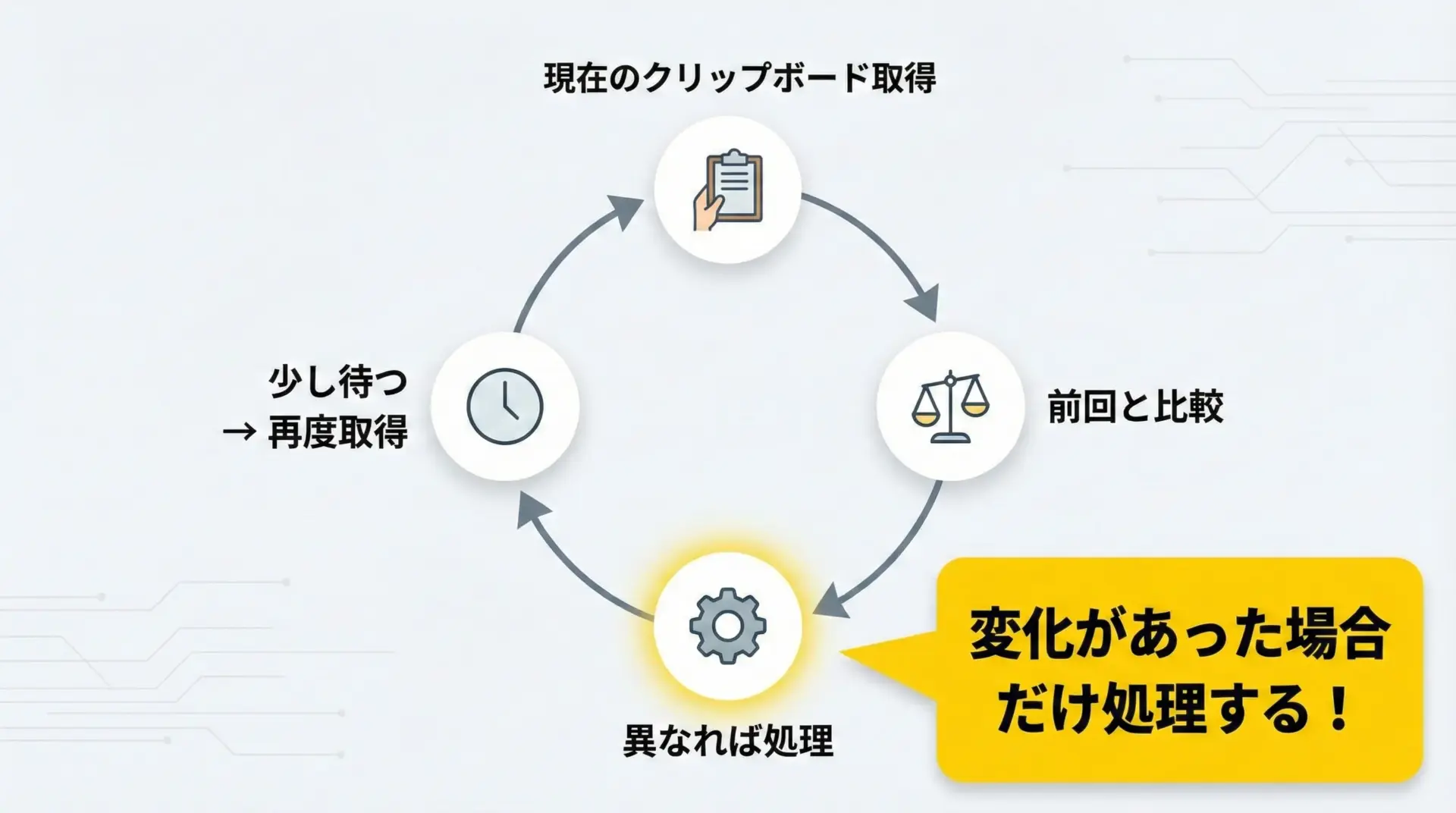 もう一歩進めて、クリップボードの内容が変わるたびに自動で何か処理をする簡易ツールも作れます。