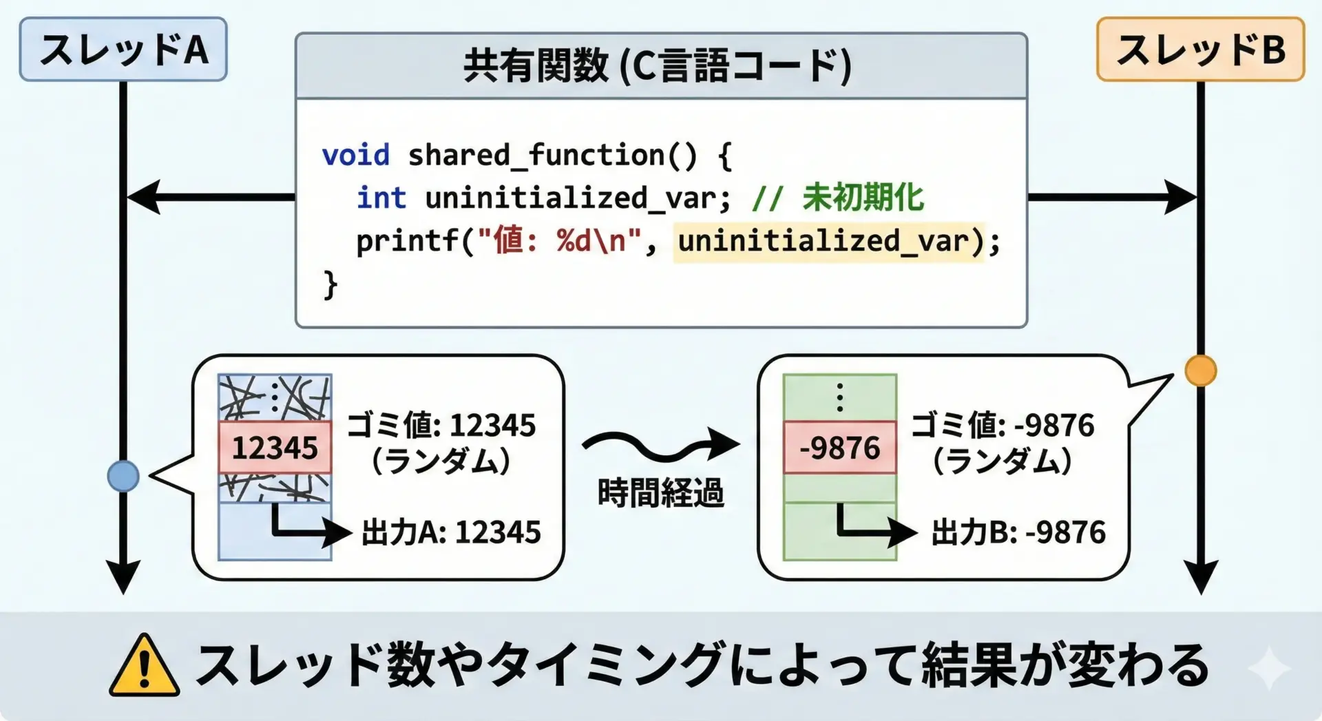 マルチスレッドでは、スケジューリングやスタックレイアウトが実行ごとに変化するため、未初期化変数の影響がより顕著になります。