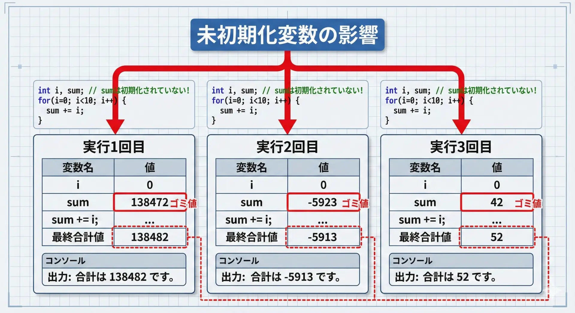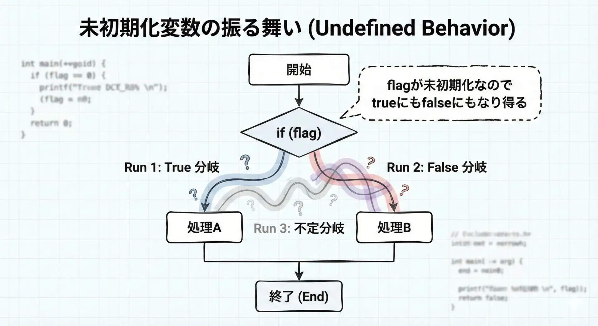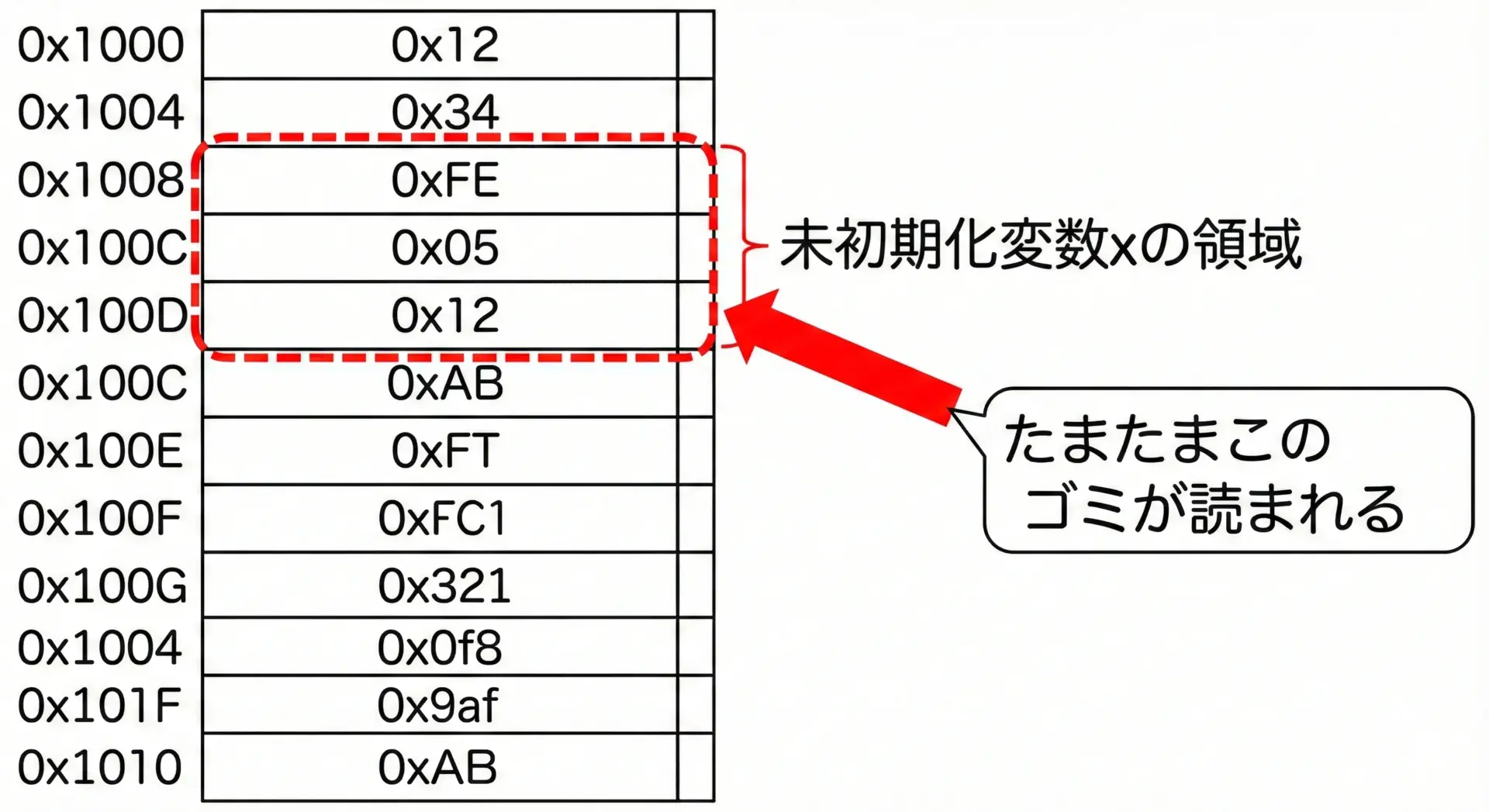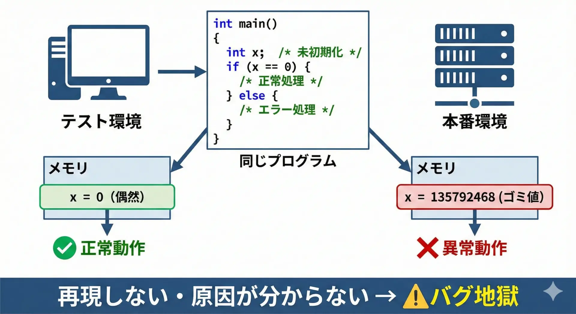 未初期化変数が危険なのは、バグが「再現性の低い、原因不明な振る舞い」になりやすいからです。