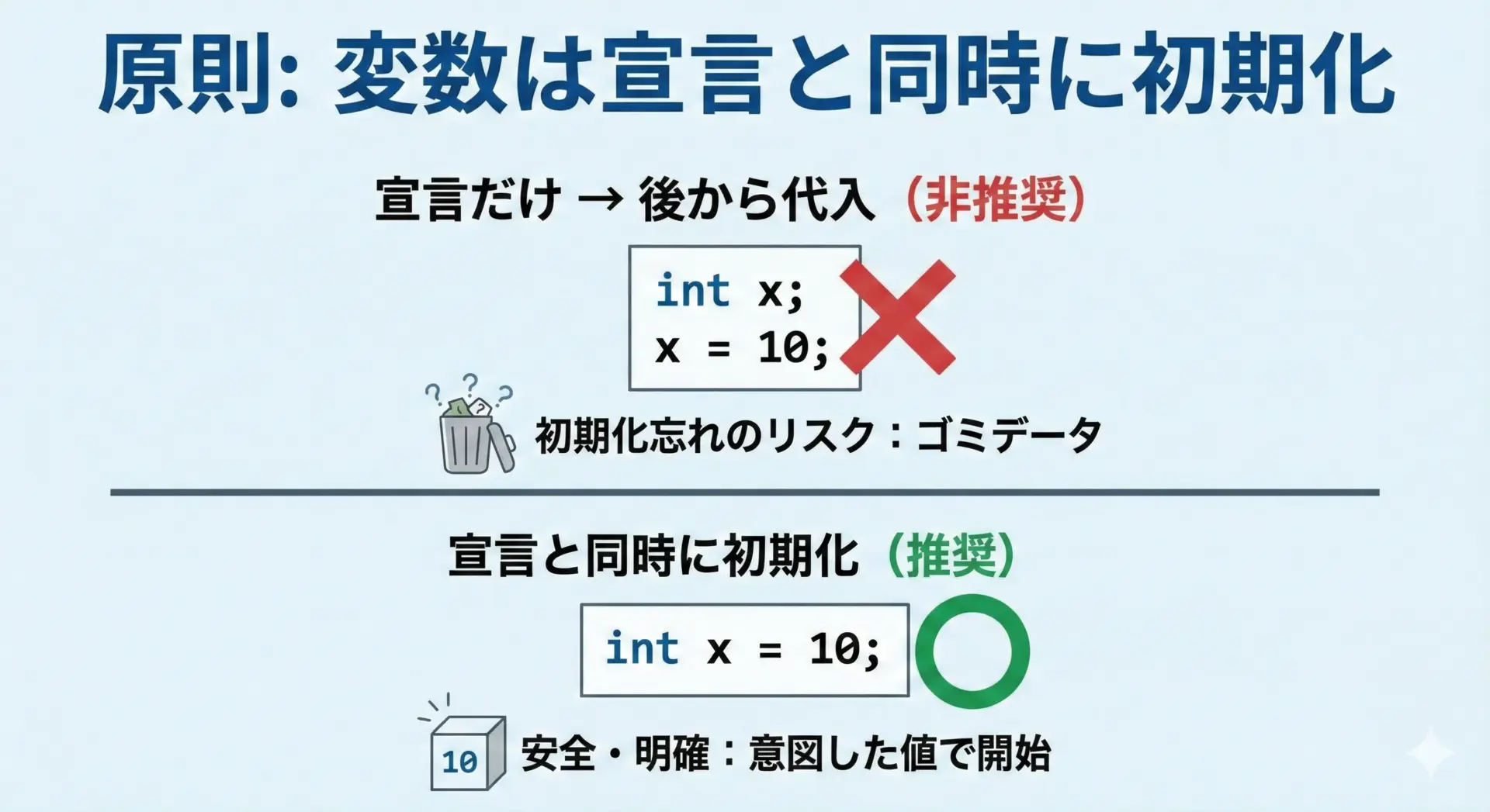 最も基本かつ強力な対策は、「変数は宣言と同時に必ず初期化する」というルールを徹底することです。