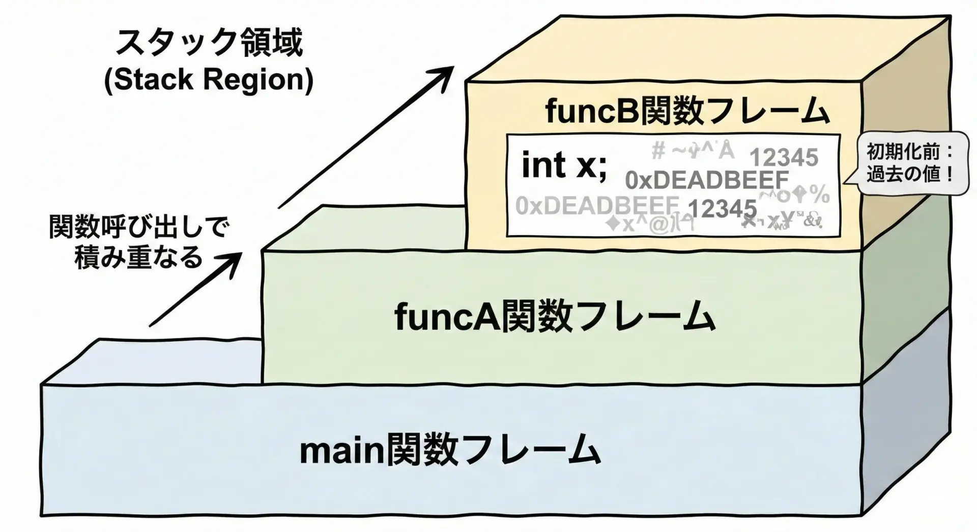 自動変数は初期値を持たず、不定値を使った瞬間に未定義動作となり、テストと本番で挙動が変わる厄介な問題を生みます。
