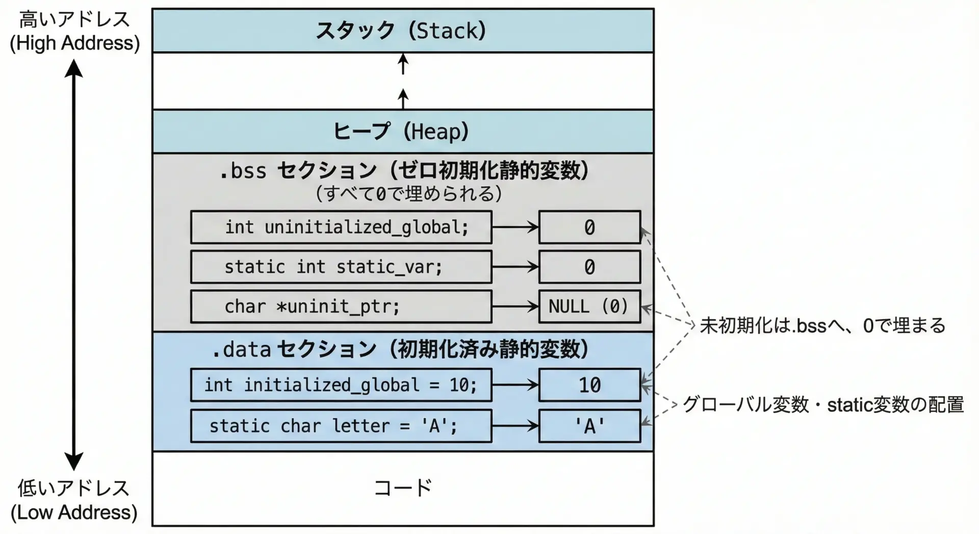 - 静的記憶域期間(グローバル変数・static変数)は0で初期化される